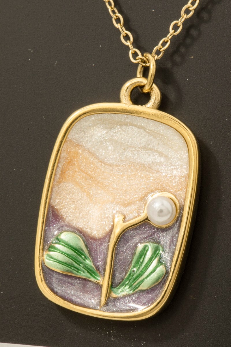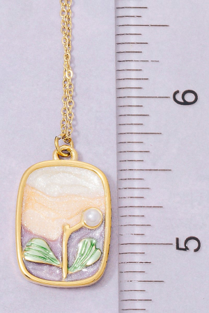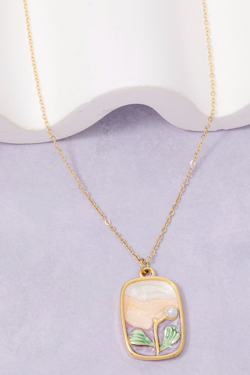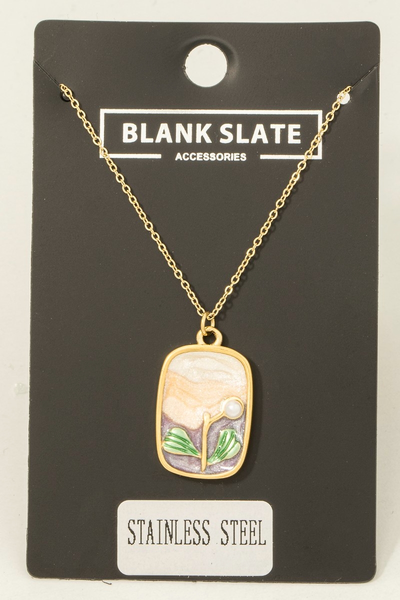 - This necklace showcases a timeless stainless steel pearl & glitter rectangle pendant style. Elevate your ensemble with this necklace that effortlessly captures the essence of refined fashion.