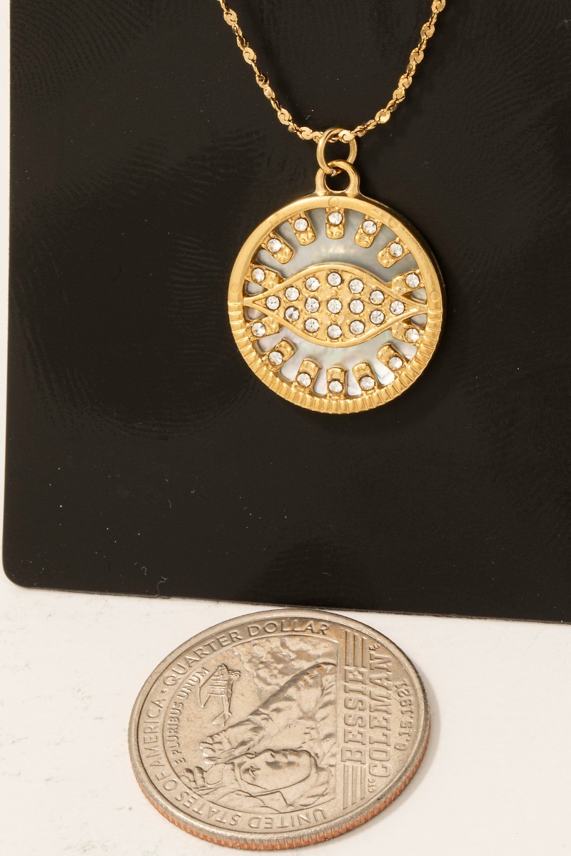 - This necklace displays a fashionable stainless steel studded evil eye pendant style. Savor the allure of detailed craftsmanship in this exquisite necklace.