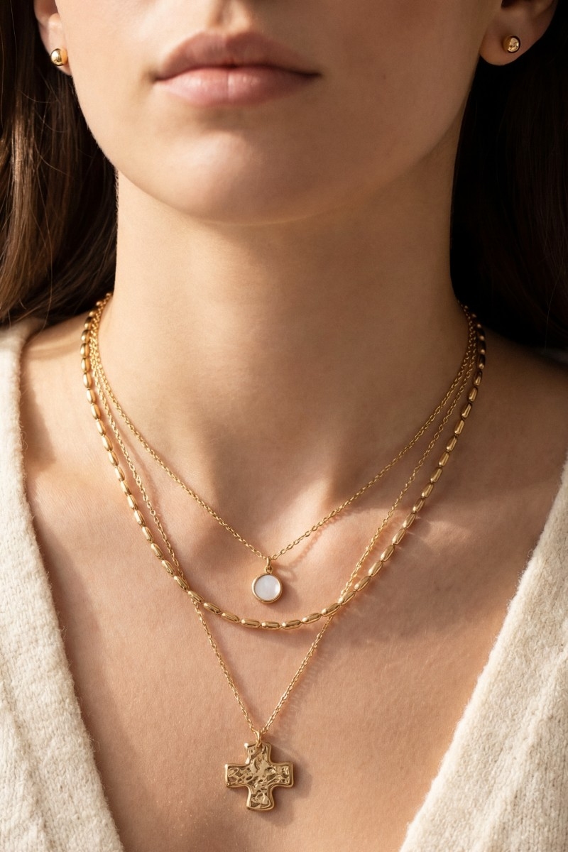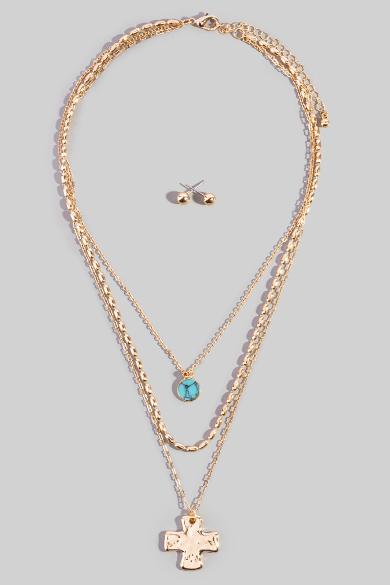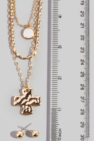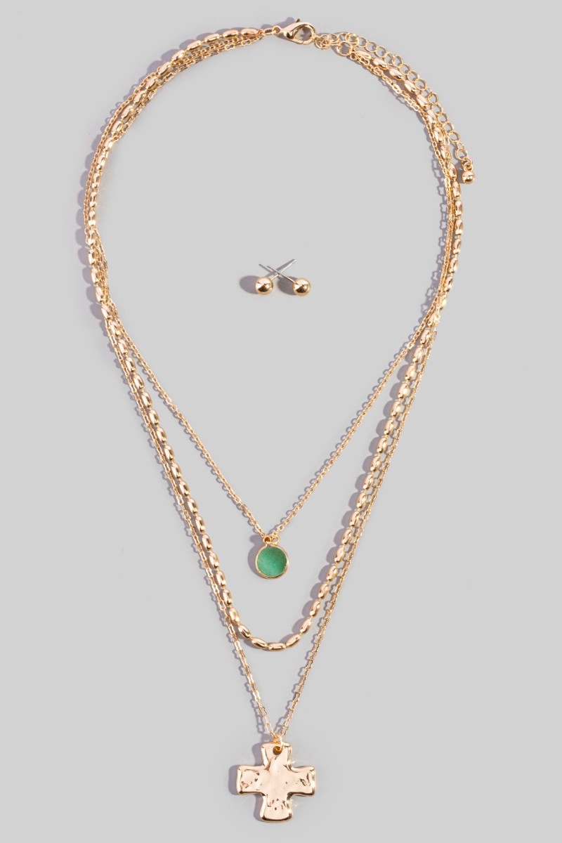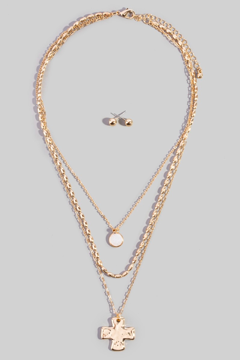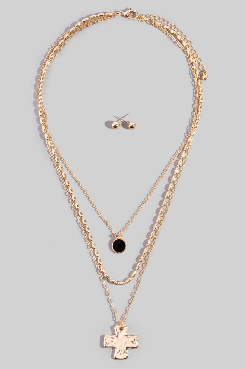 - This necklace set brings a unique triple layered chain cross pendant style. Indulge in the allure of exquisite craftsmanship as this necklace set effortlessly adds a touch of luxury to your attire.