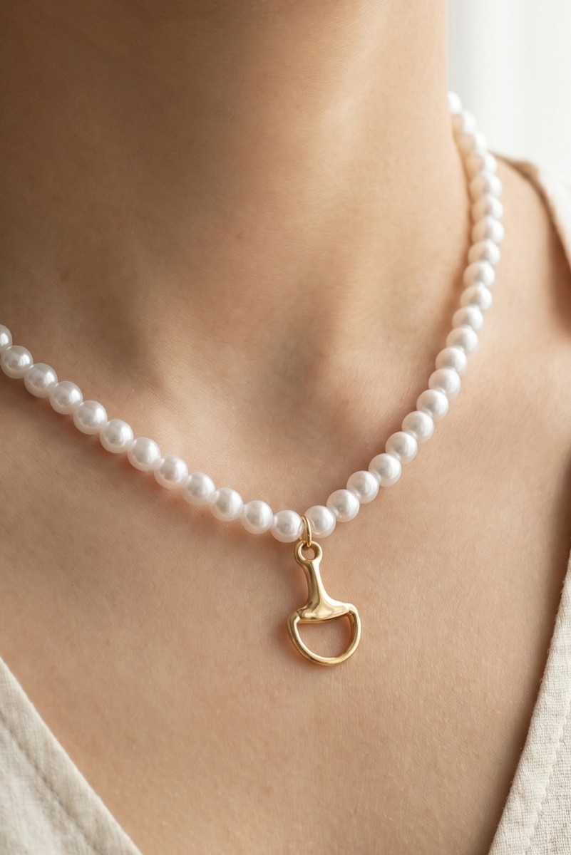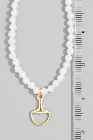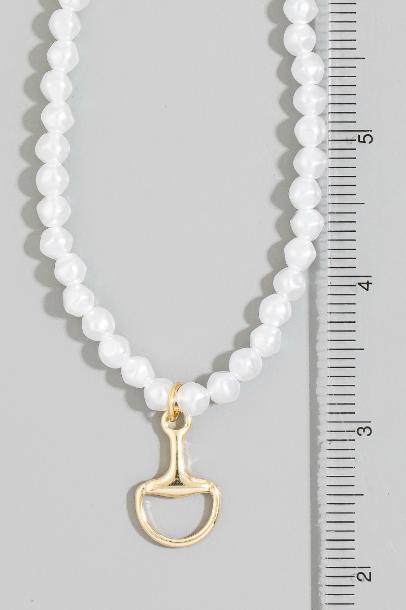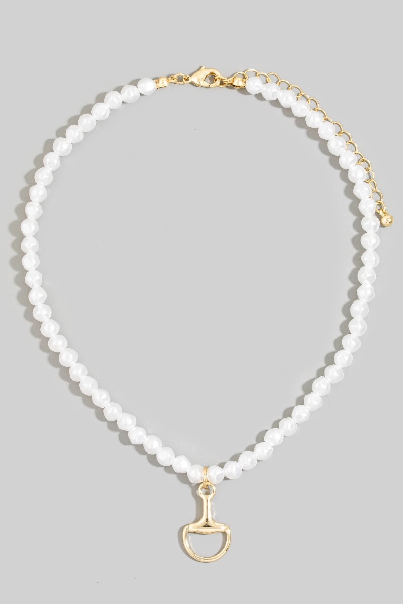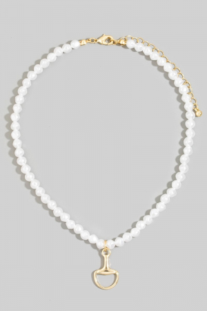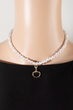 - This pendant necklace displays a vibrant white beaded choker with gold horsebit pendant style. Celebrate the art of accessorizing with this piece that effortlessly encapsulates modern trends.