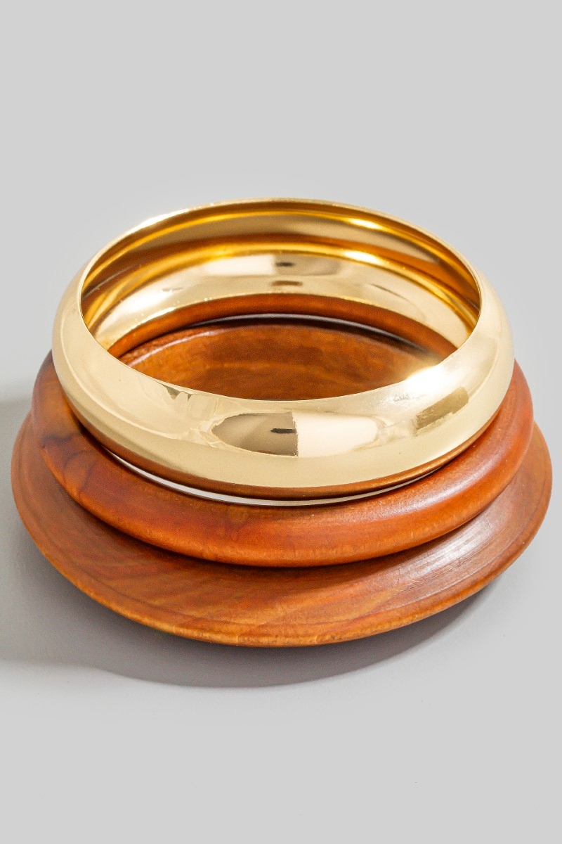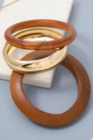• This bangle bracelet displays a vibrant 3 piece wood and metallic set style. Indulge in the artistry of accessorizing with this unique piece.