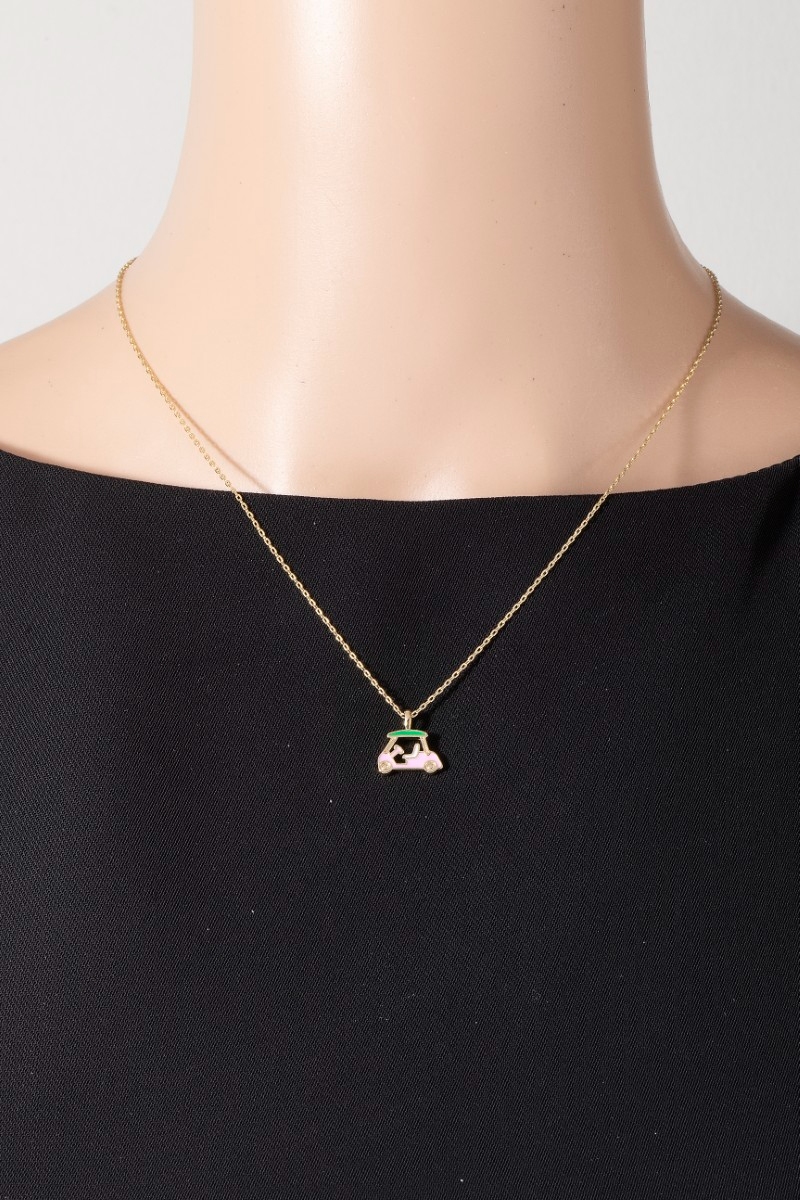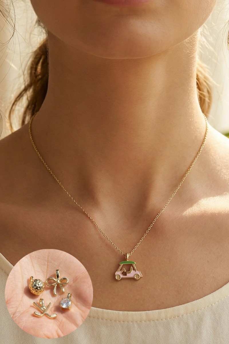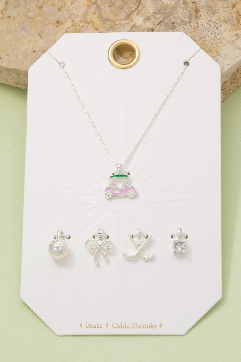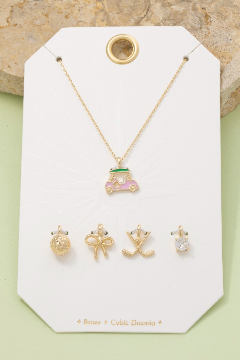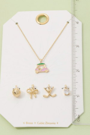 - This necklace introduces a unique assorted five piece golf theme charms style. Indulge in the artistry of accessorizing with this unique piece.