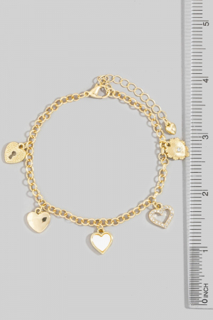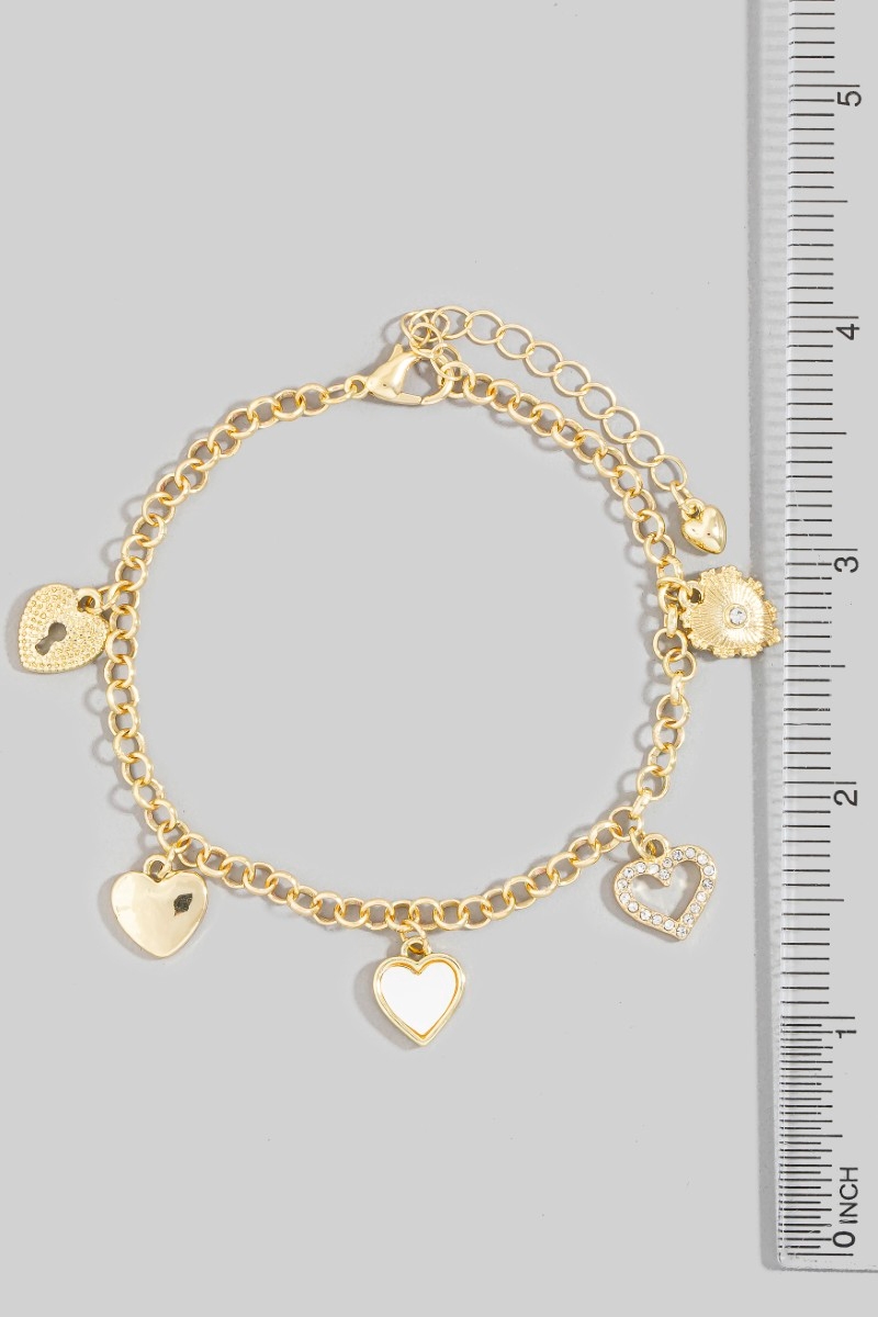 - This chain bracelet brings a stunning assorted heart charms style. Witness the perfect fusion of style and functionality as this chain bracelet effortlessly complements your lifestyle.