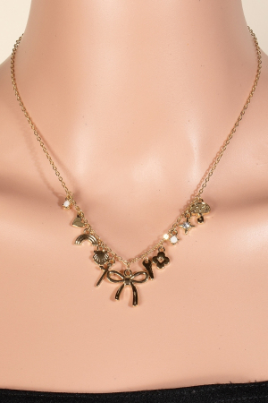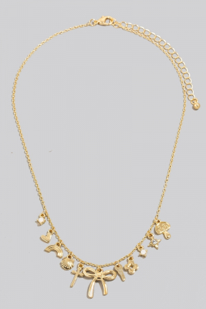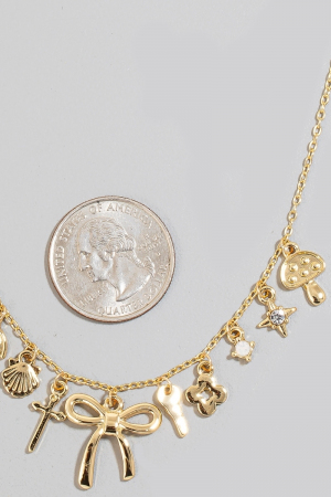 - This chain necklace displays a fashionable assorted metallic charms style. Indulge in the allure of exquisite craftsmanship as this chain necklace effortlessly adds a touch of luxury to your attire.
