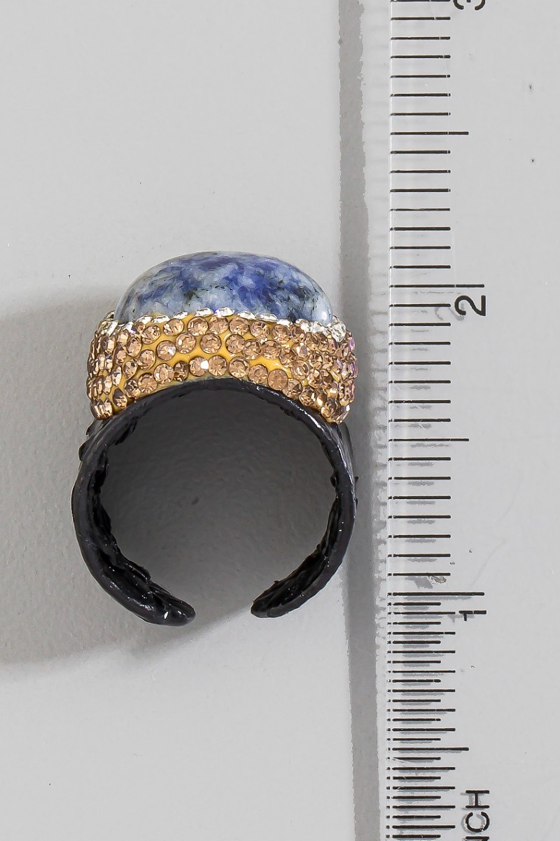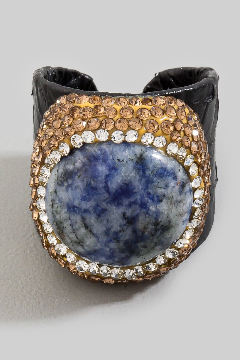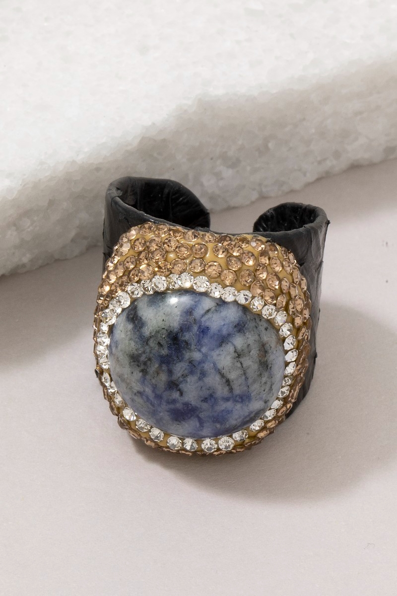 • This ring displays a fashionable blue spot jasper stone pave leather band statement style. Immerse yourself in the world of understated glamour as this ring effortlessly exudes timeless appeal.