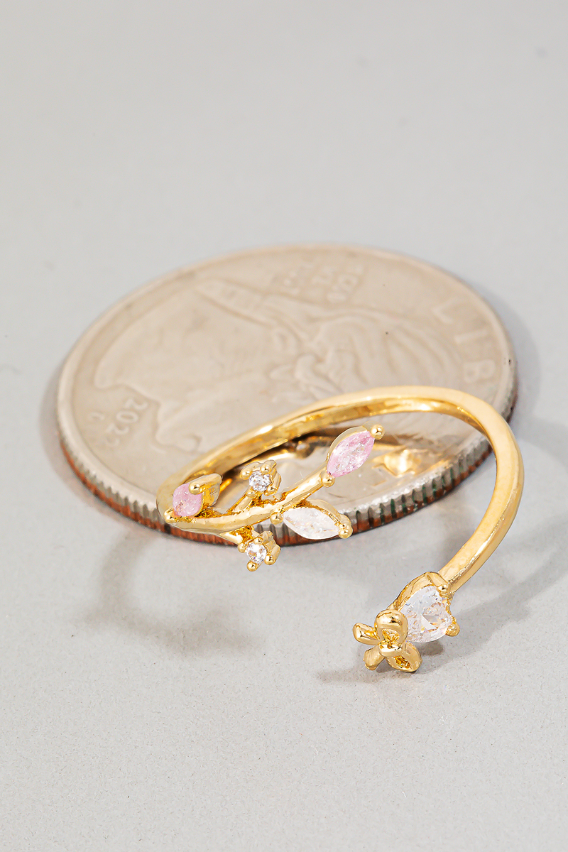 - This ring showcases a timeless cubic zirconia leaves and ribbon open band style. Step into a world of refined taste as this ring effortlessly refines the details of your outfit.