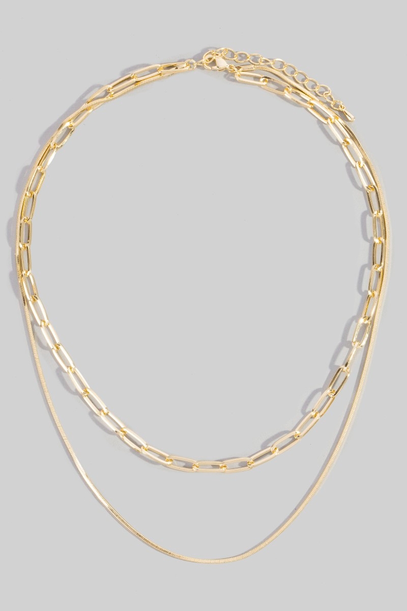 - This layered necklace features a fashionable double chain style. Elevate your ensemble with this layered necklace that effortlessly captures the essence of refined fashion.