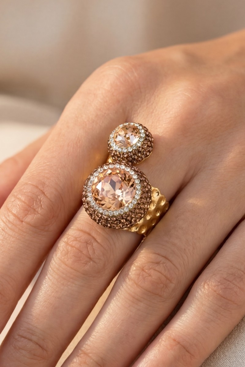 • This ring showcases a unique double crystal stone open twist style. Witness the perfect fusion of style and functionality as this ring effortlessly complements your lifestyle.