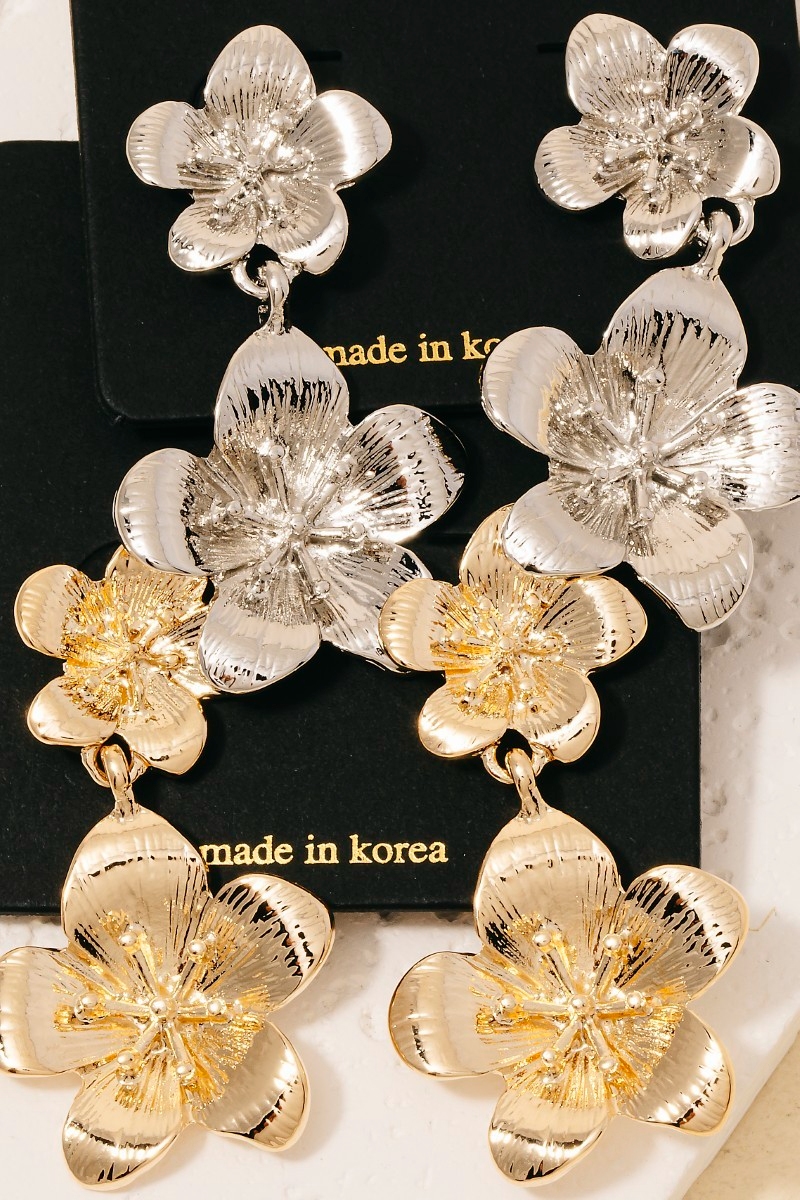 - This pair of dangle earrings brings a luxurious double metallic flower style. Immerse yourself in fashion finesse with this statement pair of dangle earrings.