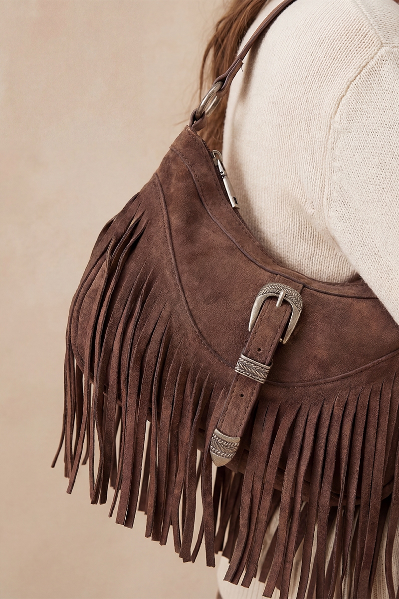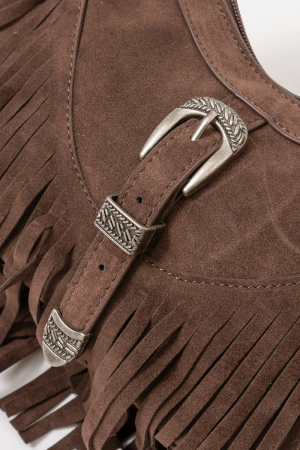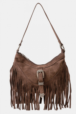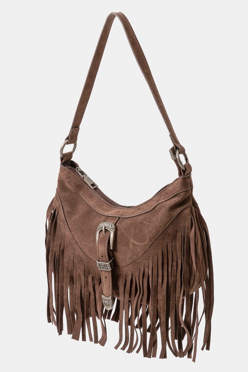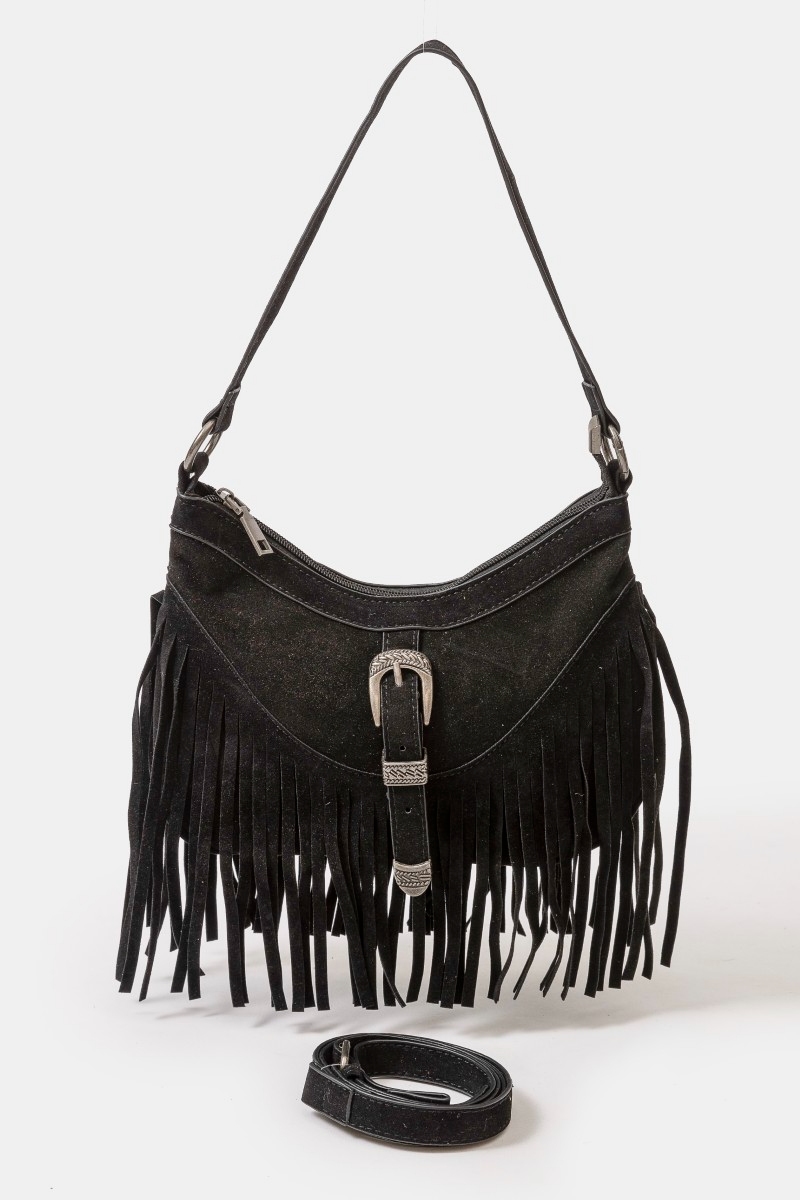 - This hand bag introduces a unique faux suede cascade fringe shoulder bag style. Witness the perfect fusion of style and functionality as this hand bag effortlessly complements your lifestyle.