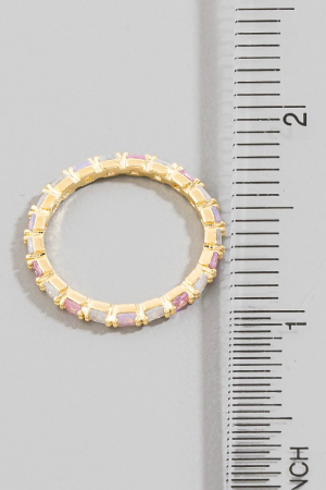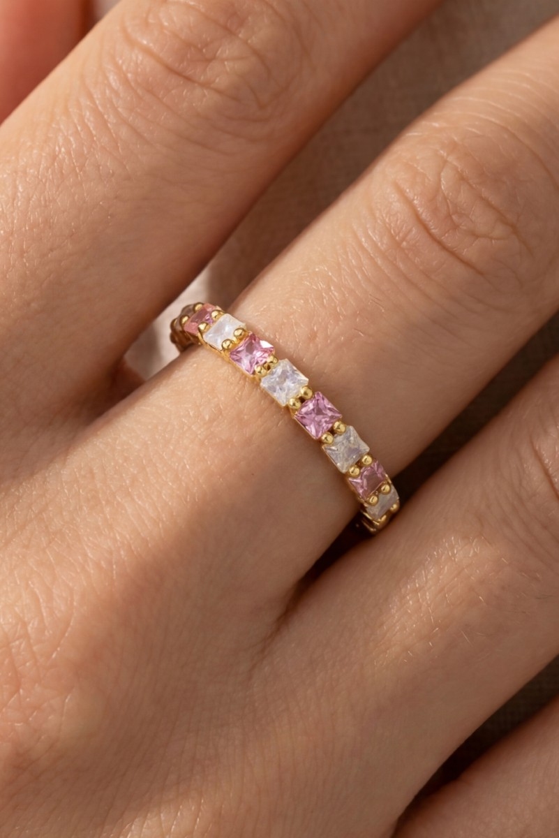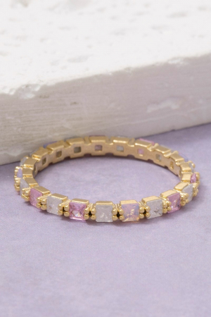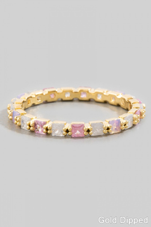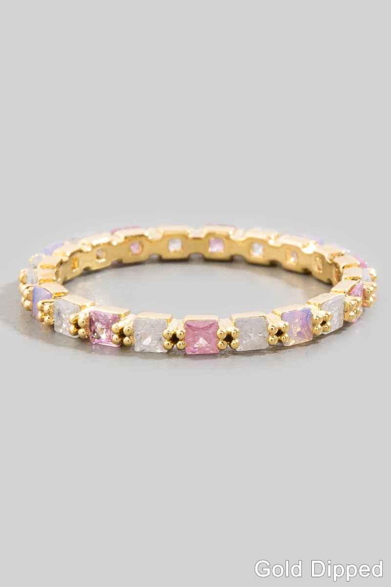 - This ring displays a fashionable gold dipped colored square cubic zirconia eternity style. Experience the joy of accessorizing with this piece that effortlessly combines versatility and charm.
