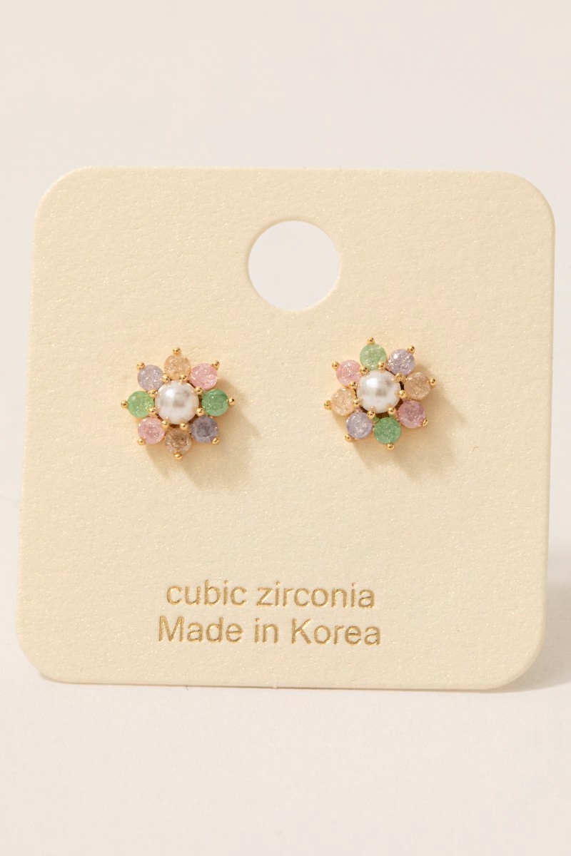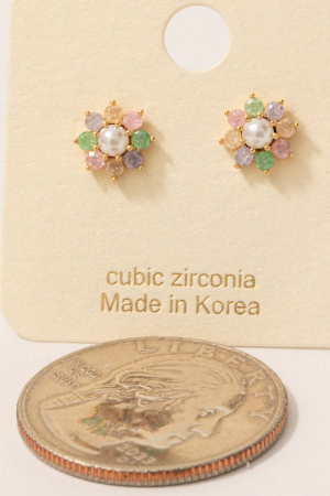 • This pair of stud earrings introduces a stunning gold dipped cubic zirconia and pearl flower style. Indulge in the artistry of accessorizing with this unique piece.