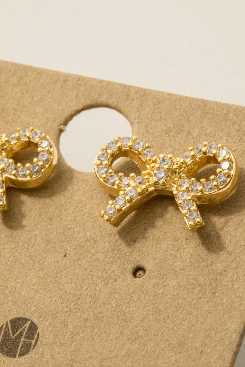 - This trending pair of earrings showcases a timeless gold dipped cubic zirconia pave ribbon bow stud earrings style. Delight in the intricate details that make this trending pair of earrings an essential element in expressing your fashion identity.