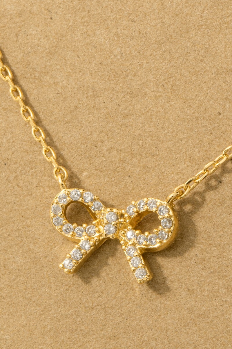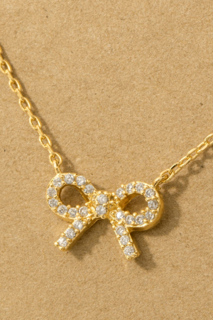 - This trending necklace brings a unique gold dipped cubic zirconia stud ribbon bow pendant necklace style. Indulge in the artistry of accessorizing with this unique piece.