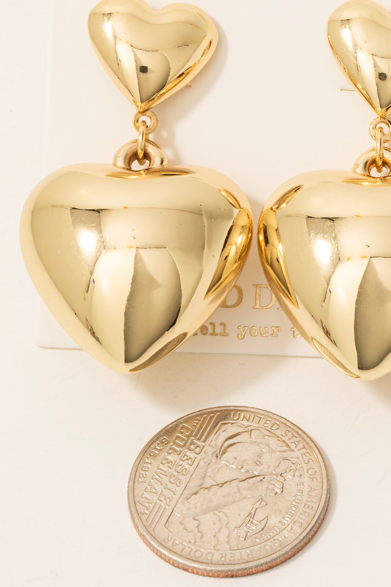 • This pair of dangle earrings brings a stunning gold dipped double rounded heart style. Unveil a new dimension of sophistication as this pair of dangle earrings effortlessly enhances the elegance of your ensemble.