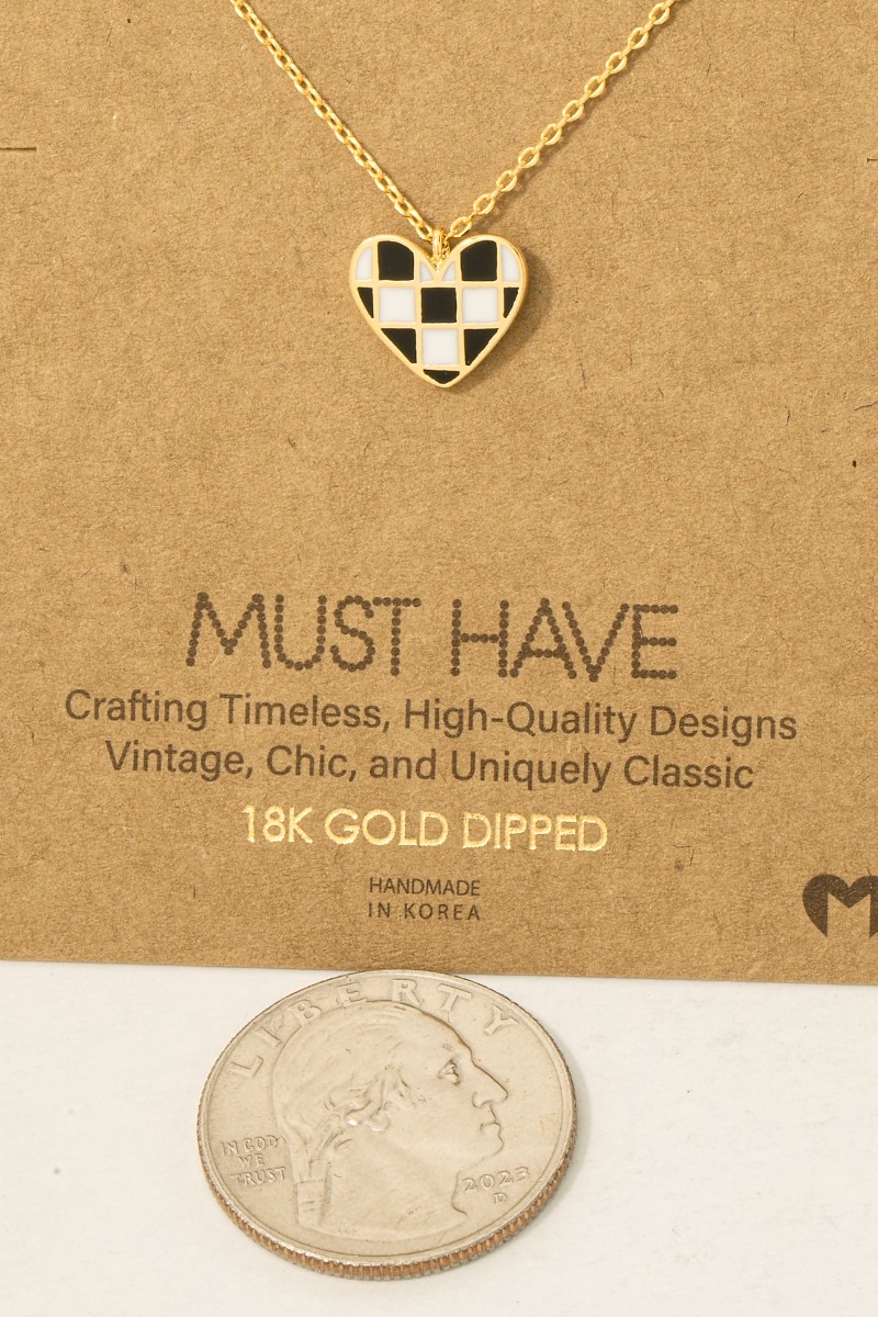 - This necklace displays a vibrant gold dipped epoxy checkered heart pendant style. Savor the craftsmanship that goes beyond the ordinary, as this necklace effortlessly captivates attention.