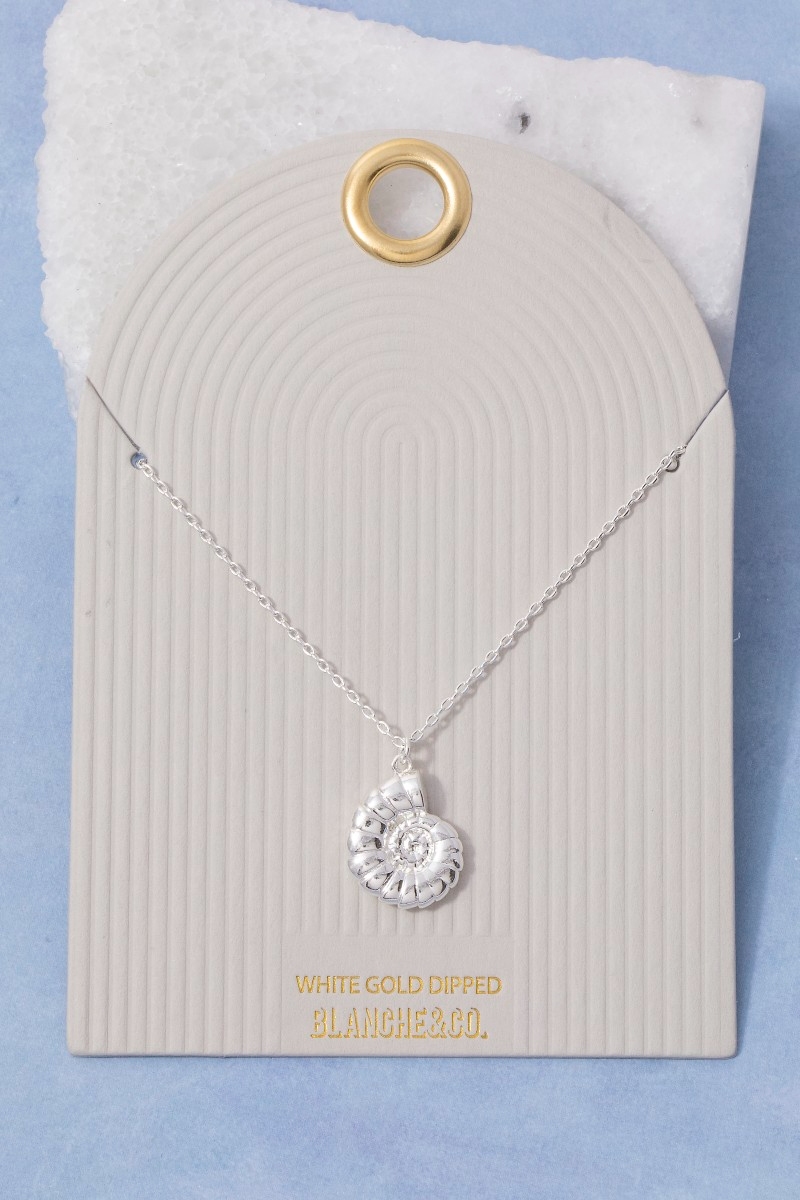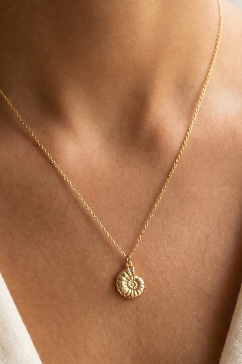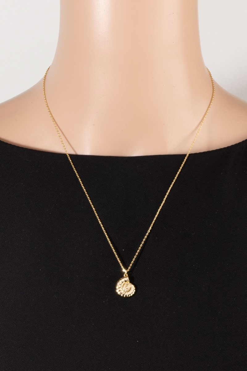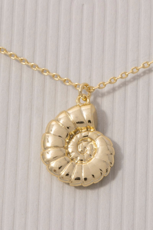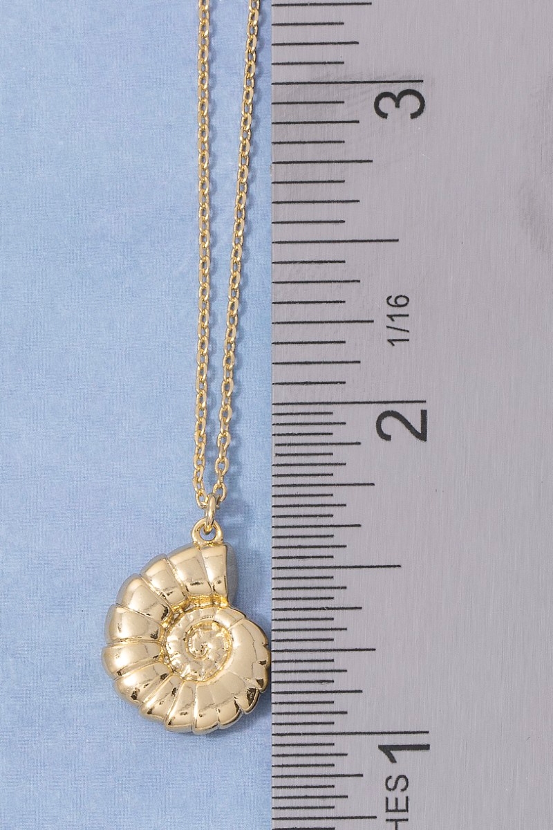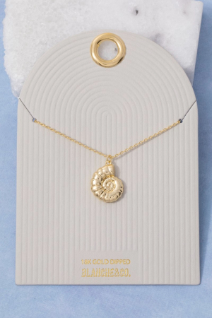 • This pendant necklace showcases a timeless gold dipped spiral shell style. Savor the craftsmanship that goes beyond the ordinary, as this pendant necklace effortlessly captivates attention.