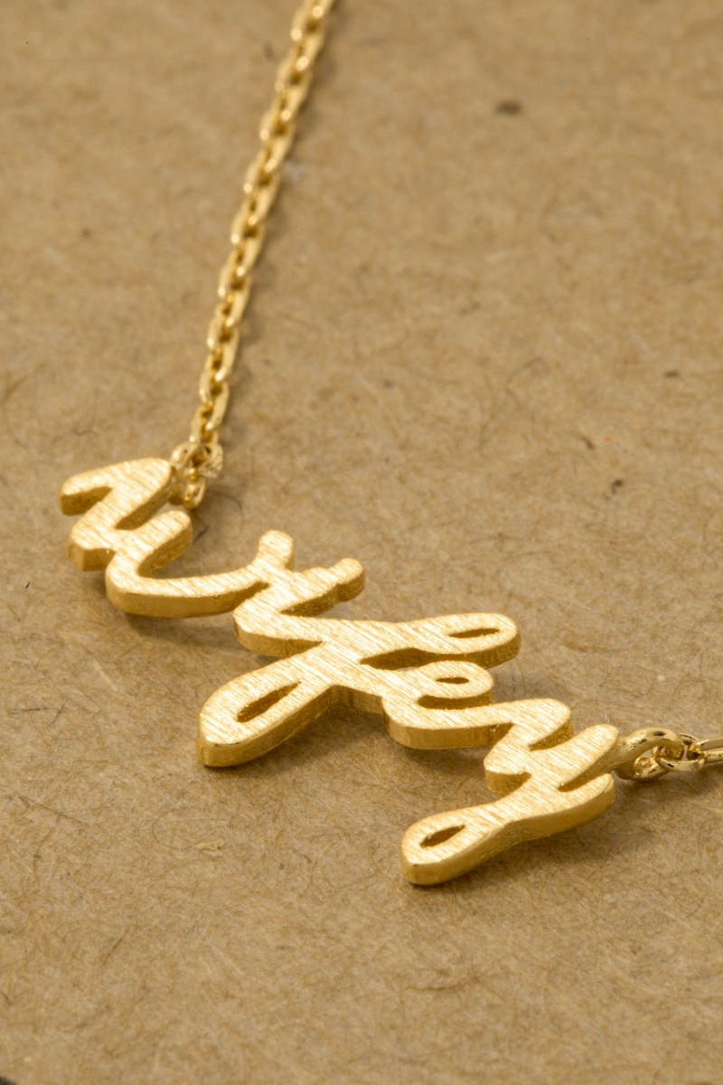 - This trending necklace introduces a unique gold dipped wifey handwritten pendant necklace style. Unveil modern elegance with this subtly intricate trending necklace.