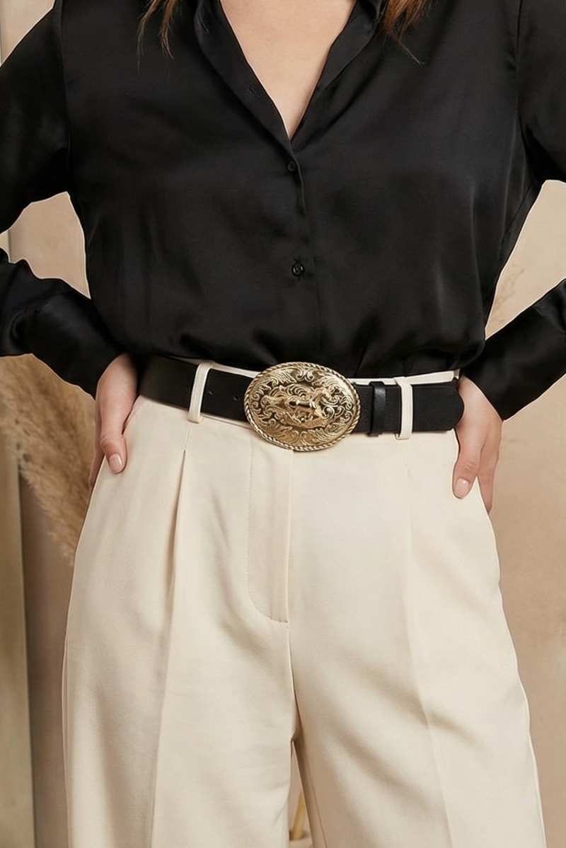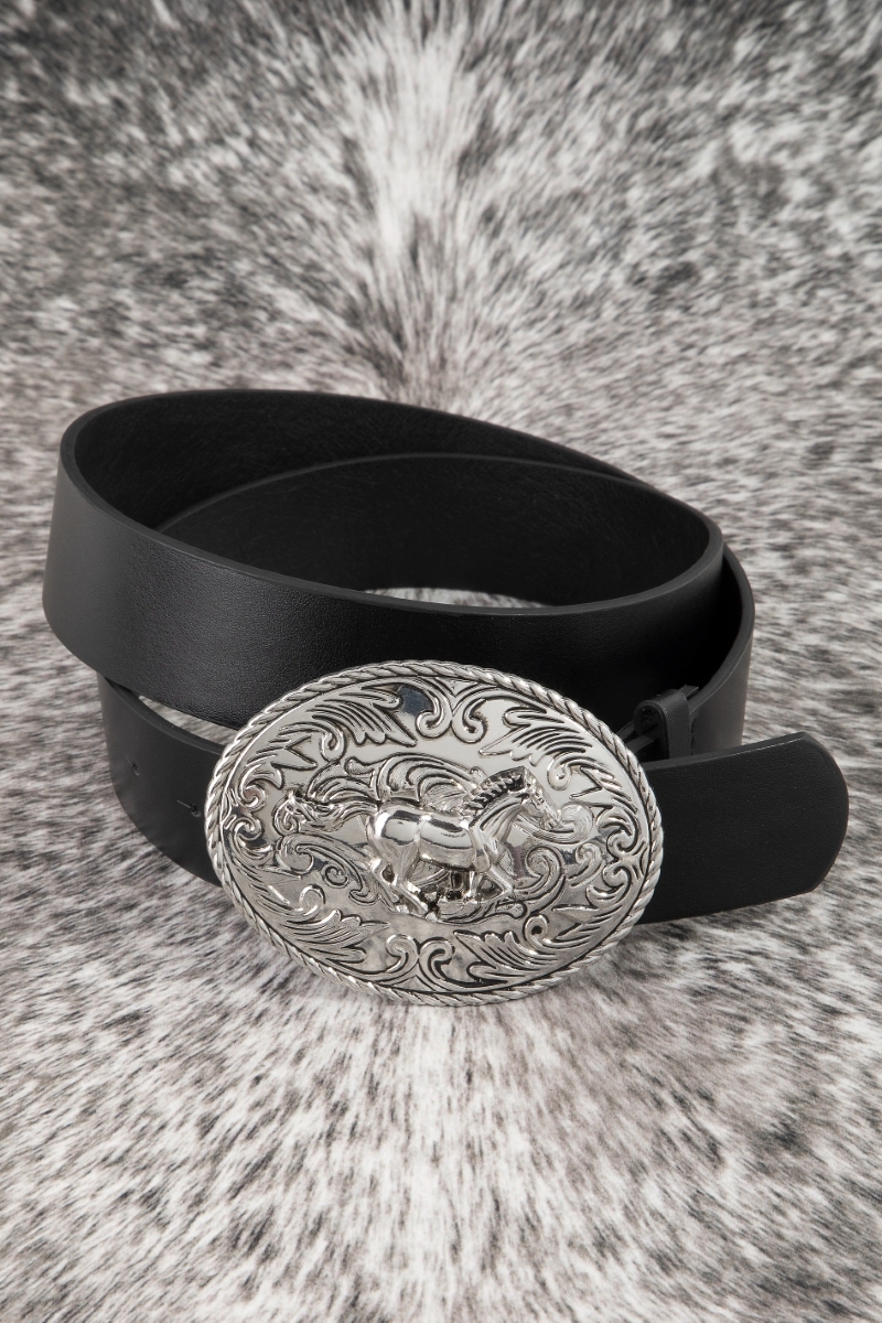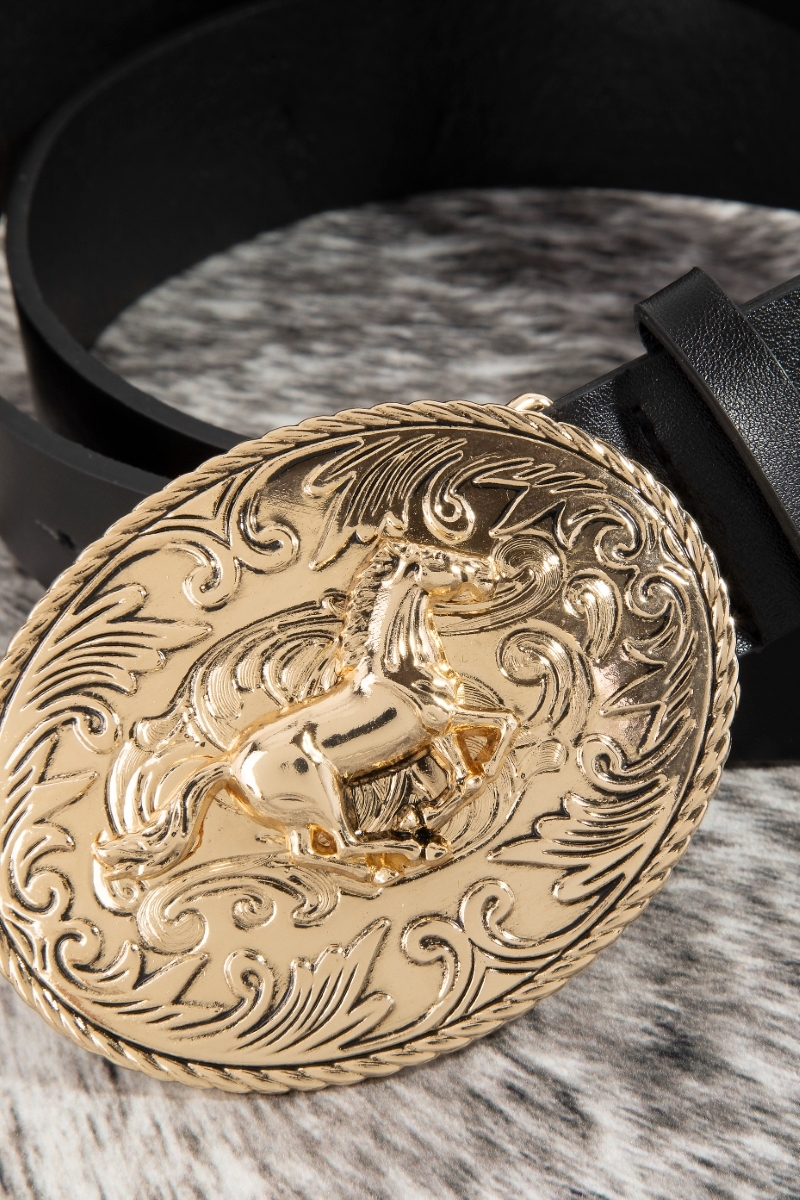 - This belt features a fashionable large western horse medallion buckle style. Experience refined sophistication with this understated yet stylish piece.