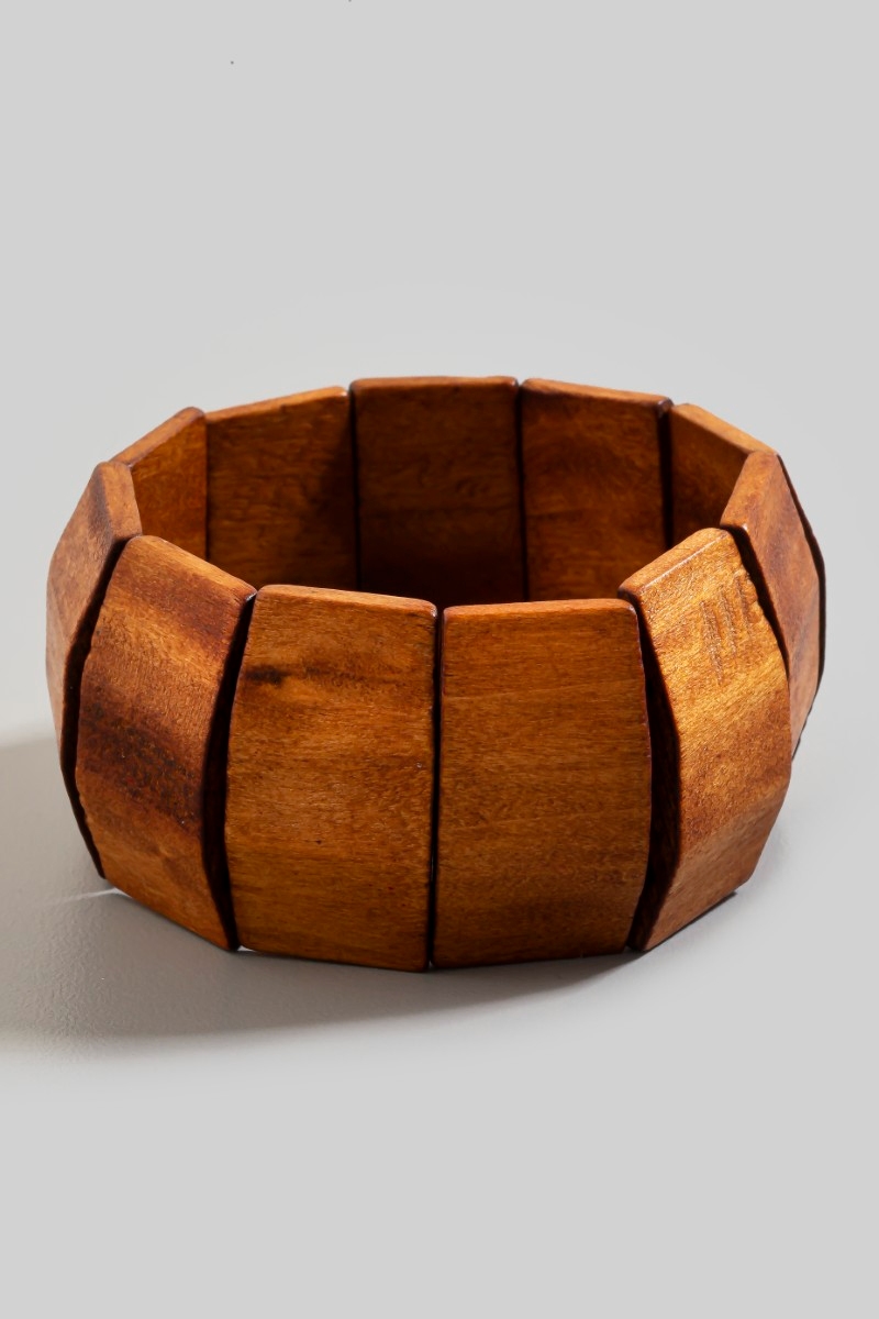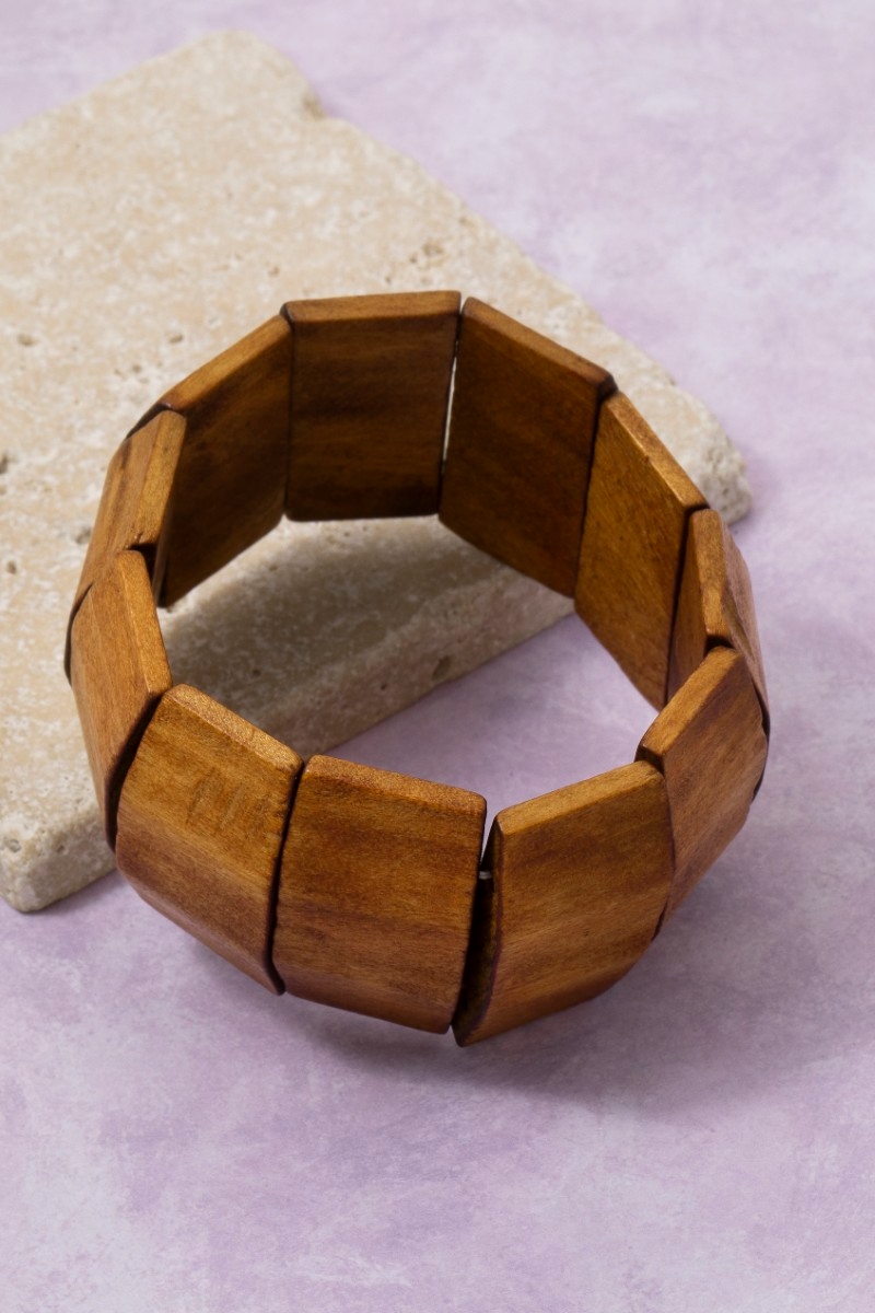- This bracelet displays a fashionable large wooden rectangles elastic style. Delight in the nuanced details that make this bracelet a testament to fine design and impeccable taste.