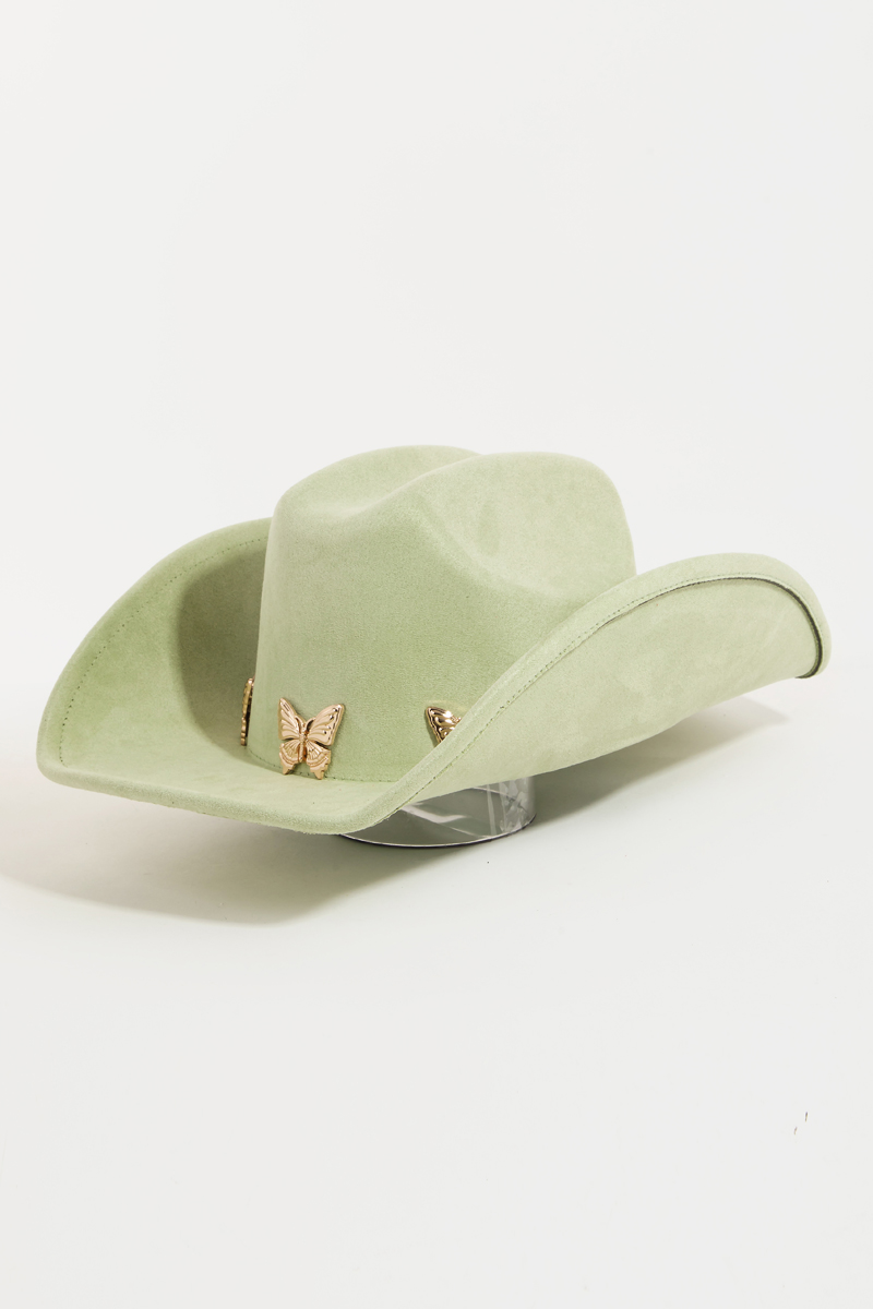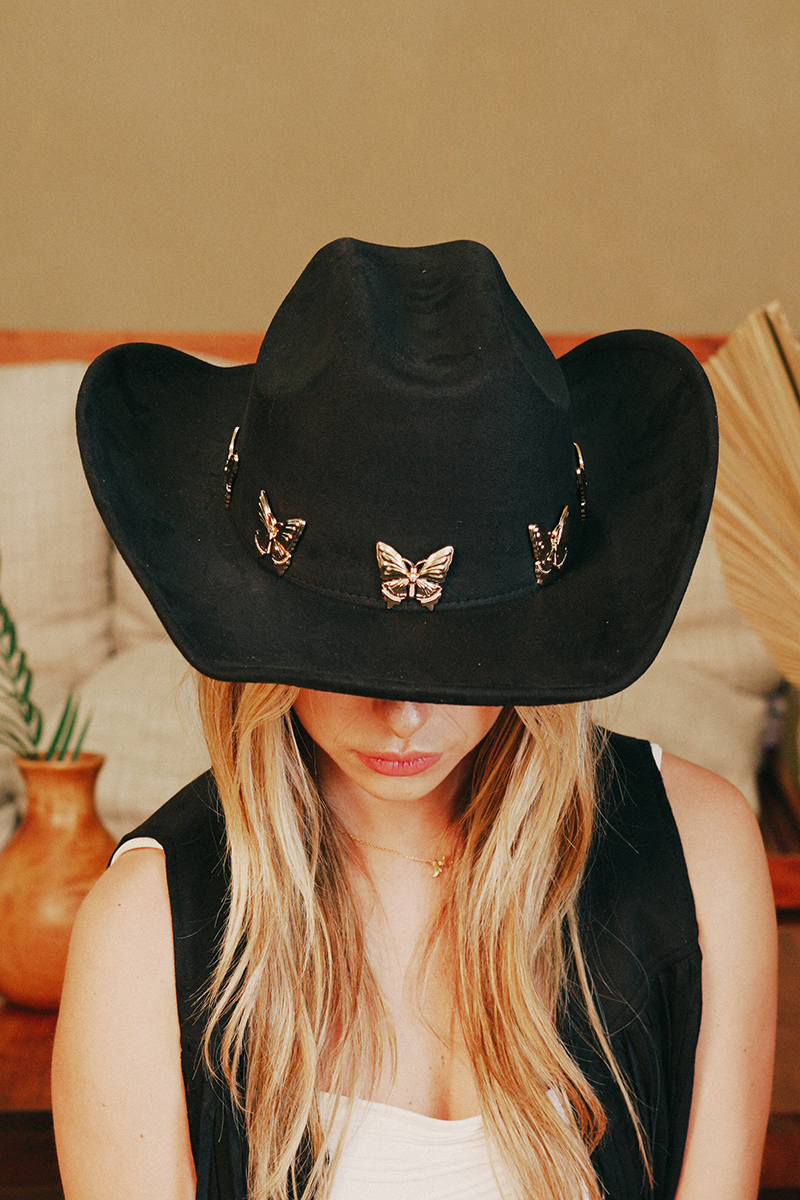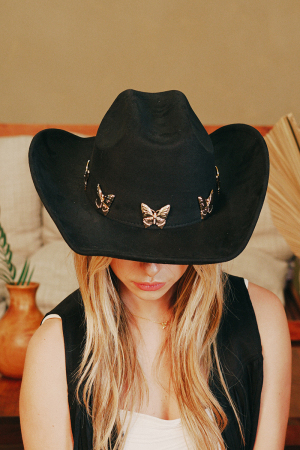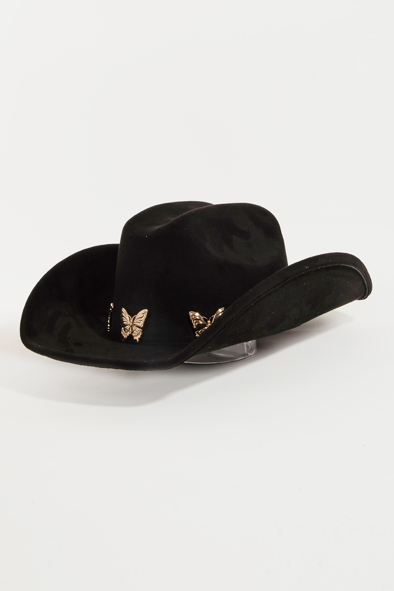 • This cowboy hat brings a stunning metallic butterfly charms soft style. Delight in the nuanced details that make this cowboy hat a testament to fine design and impeccable taste.