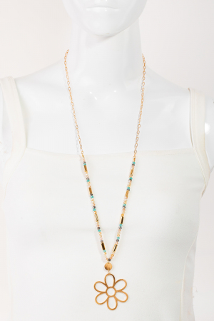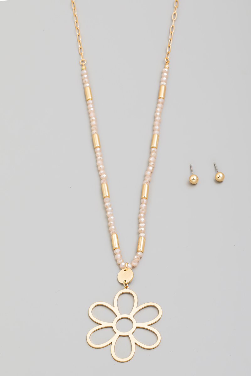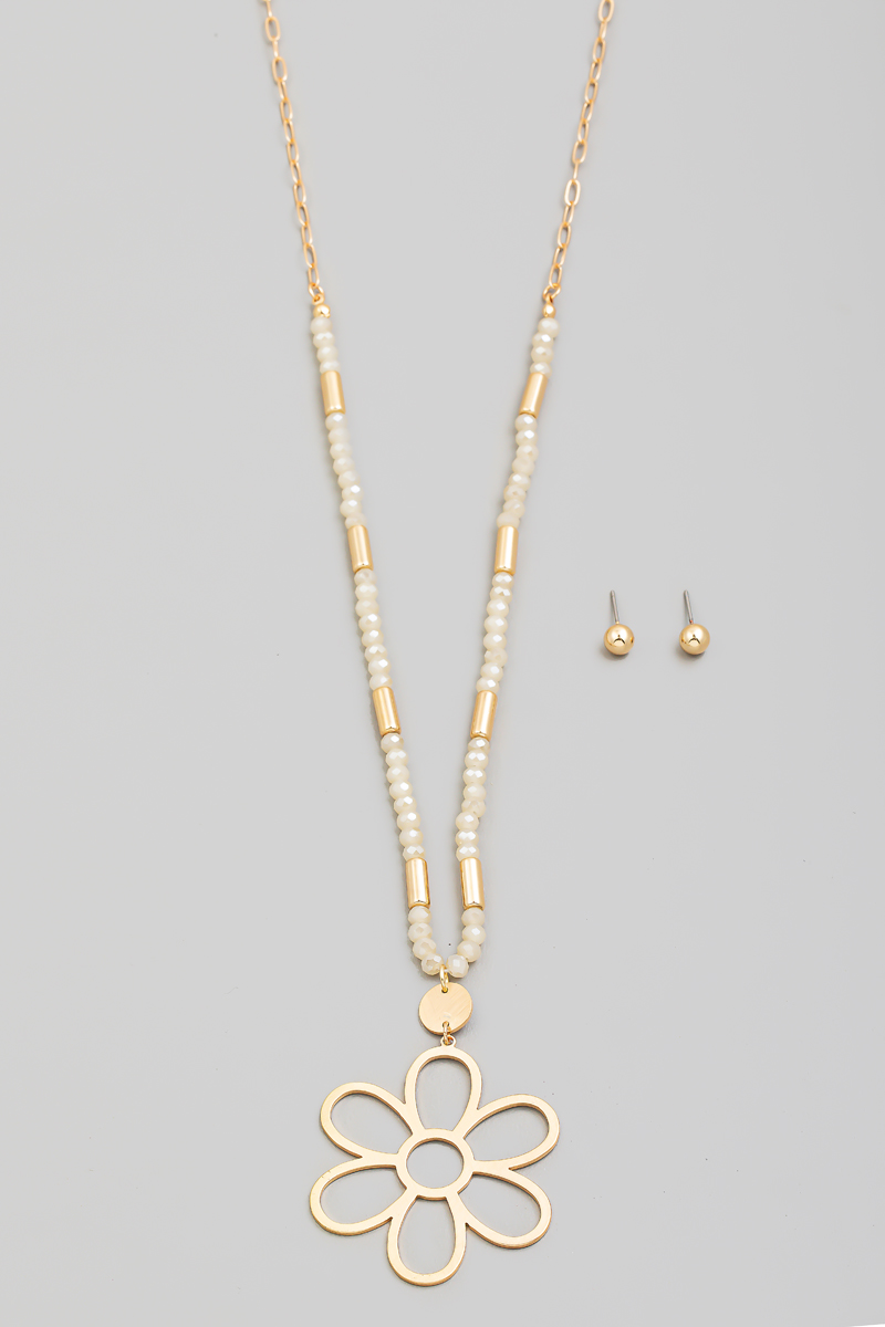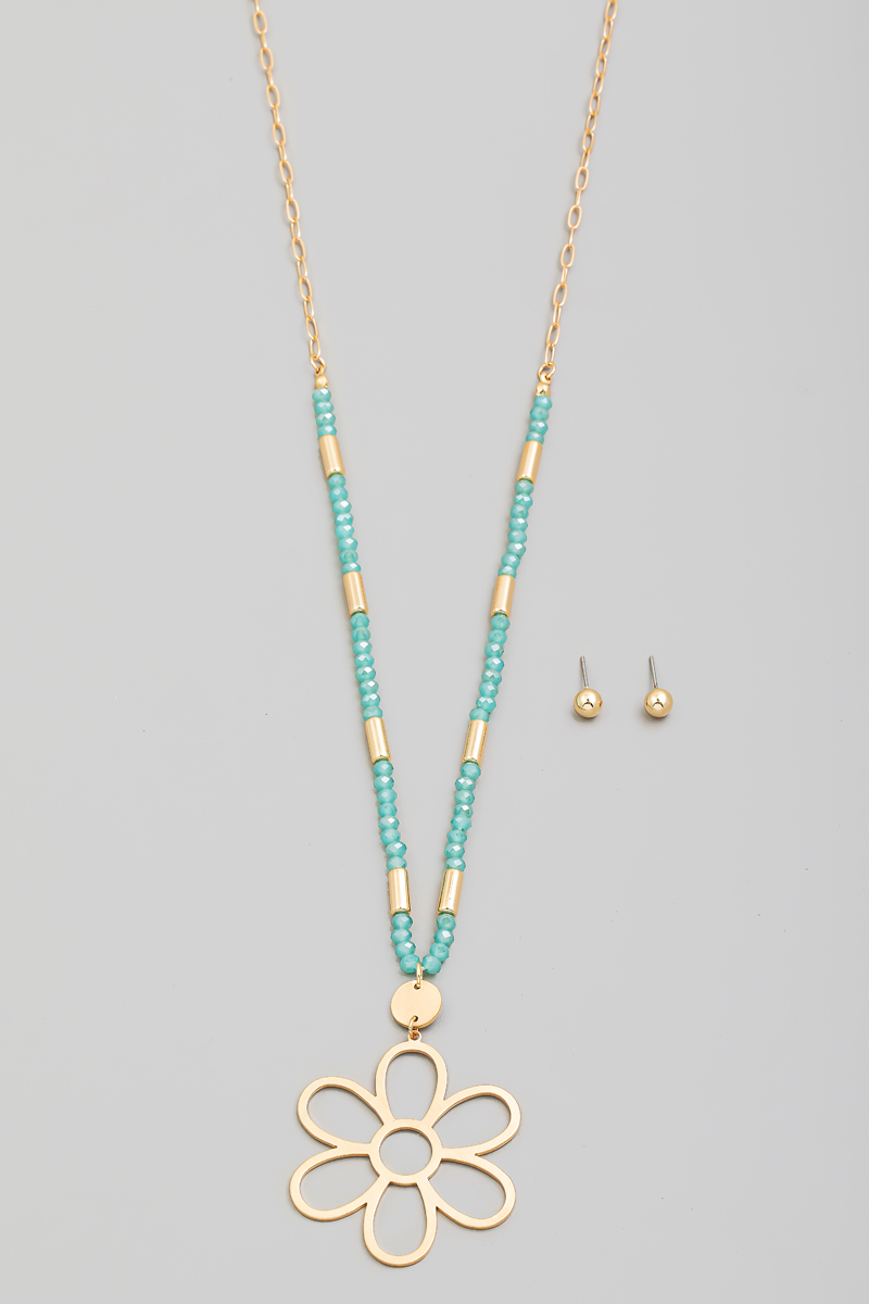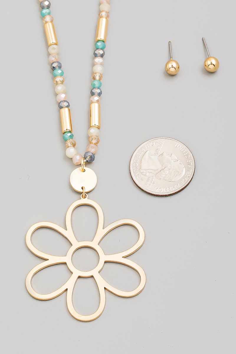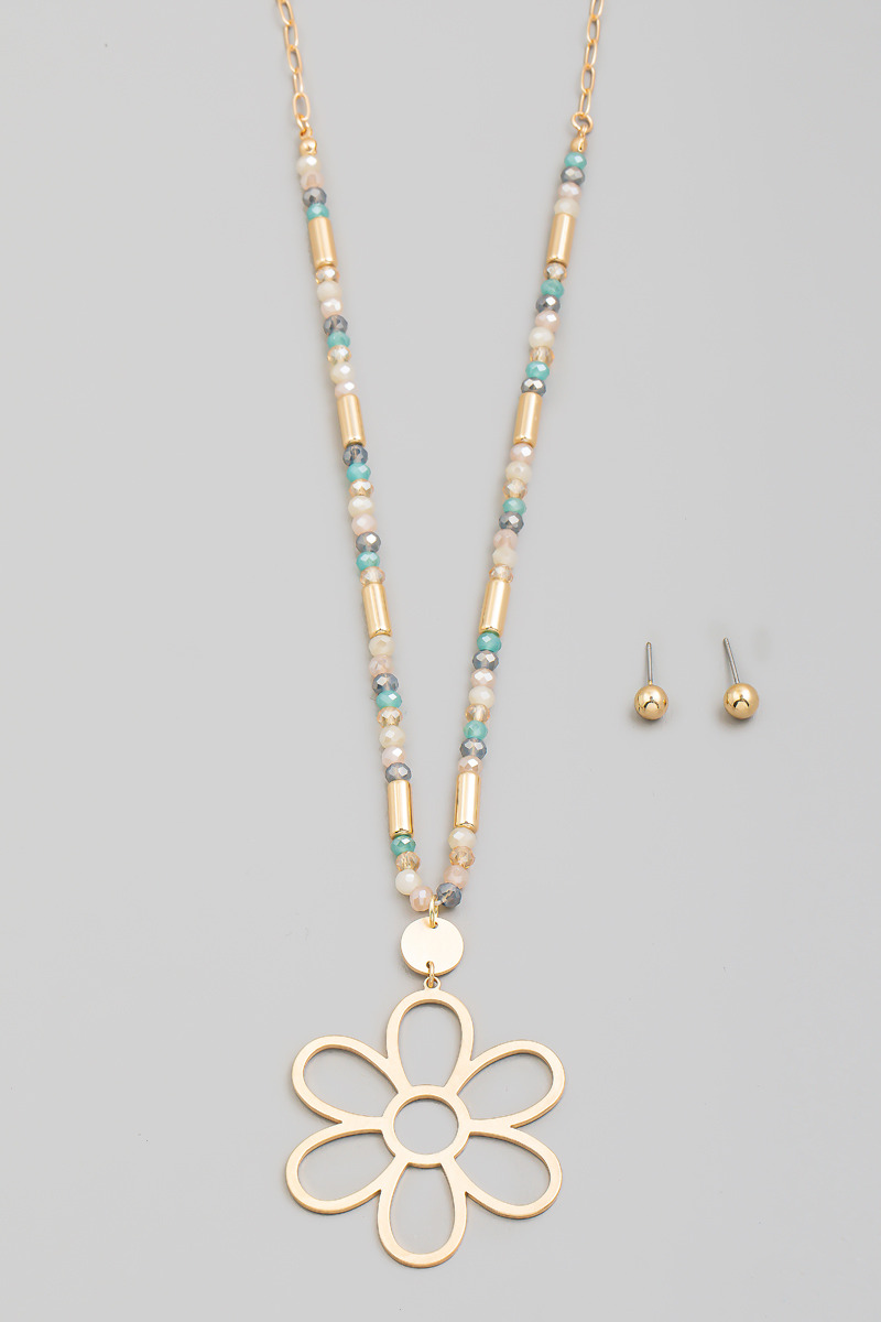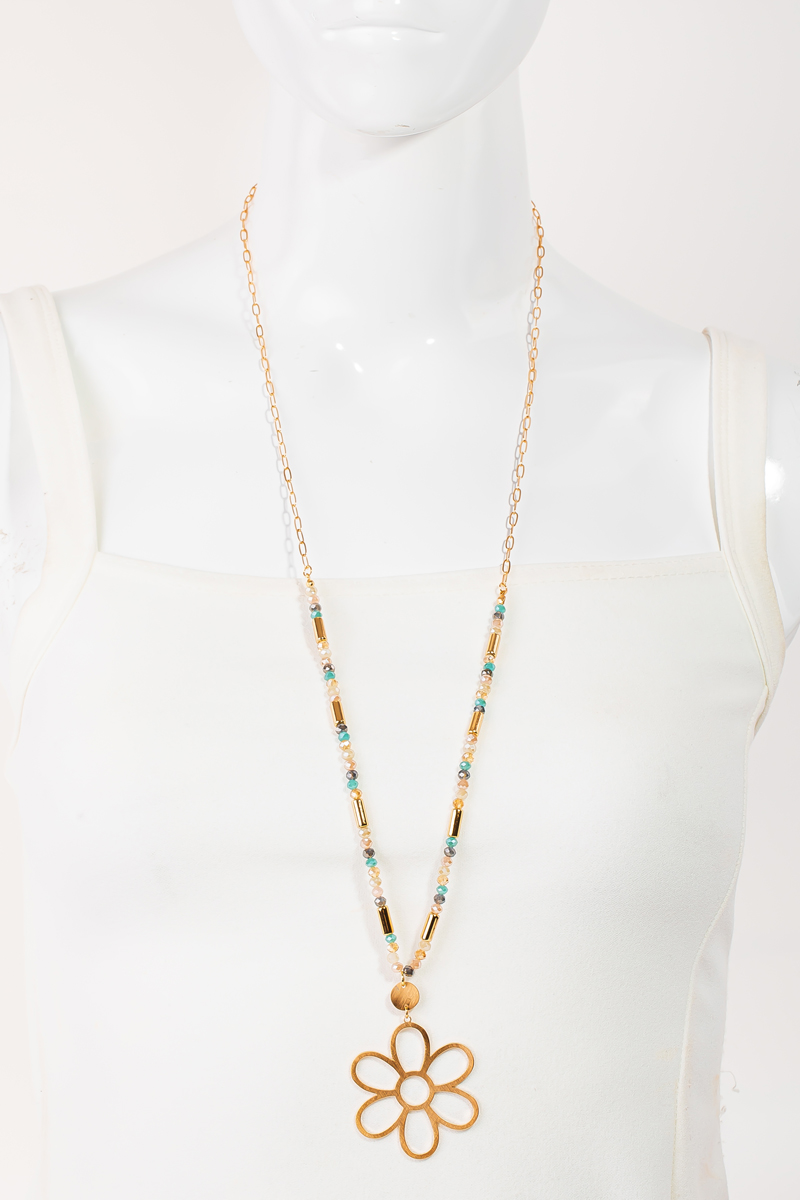 - This long necklace brings a stunning metallic flower pendant beaded set style. Immerse yourself in fashion finesse with this statement accessory.