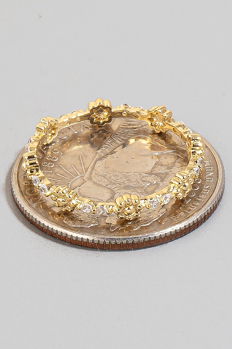 - This ring brings a unique metallic flowers and cubic zirconia studs band style. Embark on a journey of sartorial refinement as this ring effortlessly complements your fashion sense.