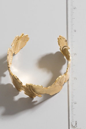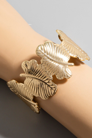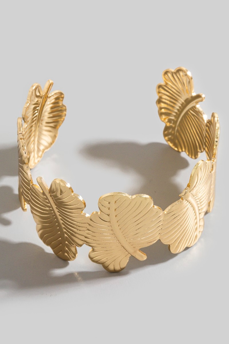 • This cuff bracelet introduces a stunning metallic leaf link style. Explore a blend of classic charm and contemporary flair.