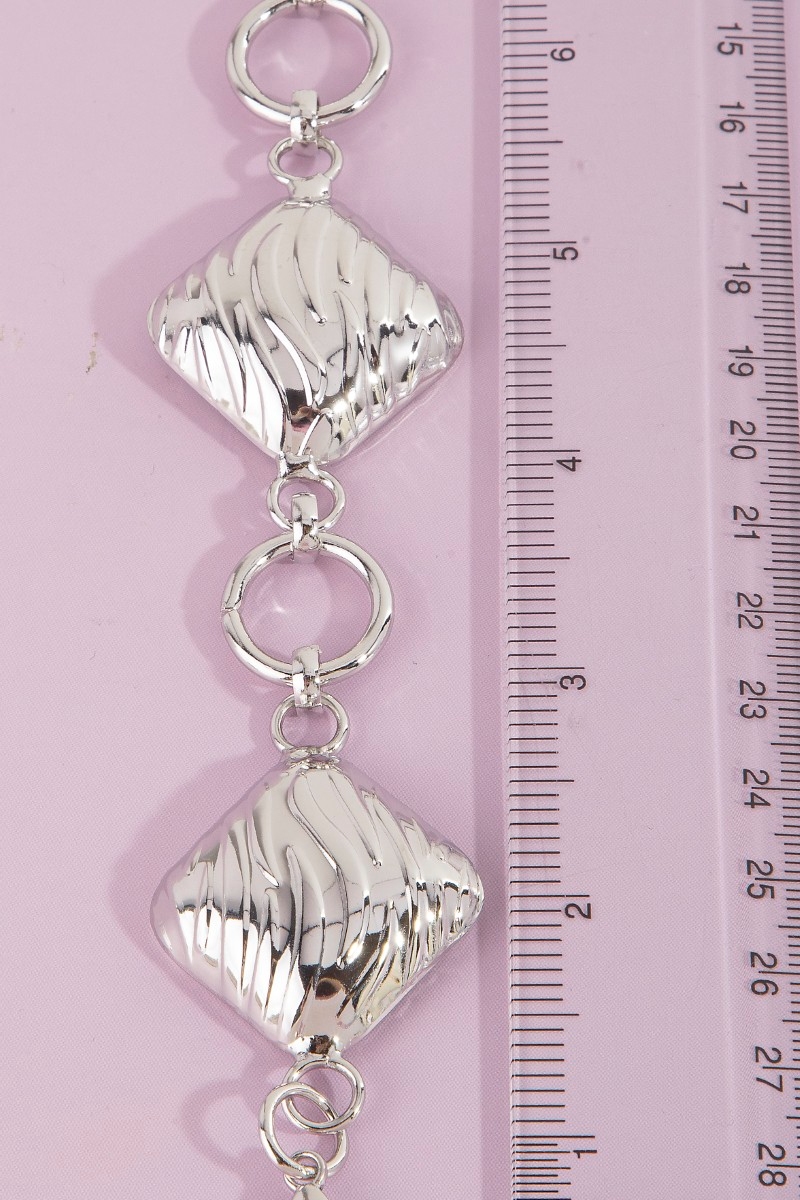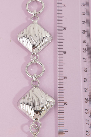 - This chain belt brings a stunning metallic textured square style. Revel in the intricate design that effortlessly distinguishes this chain belt, making it a statement piece.