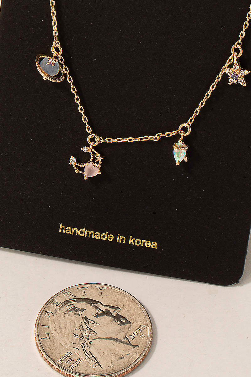 • This necklace displays a fashionable mixed space themed charms style. Experience refined sophistication with this understated yet stylish piece.