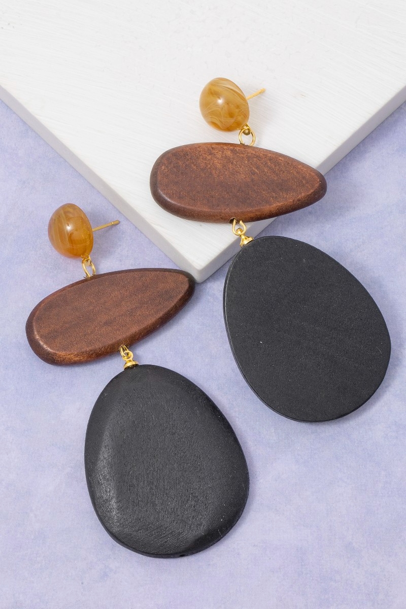 • This pair of dangle earrings brings a luxurious mixed wooden ovals tiered style. Unveil modern elegance with this subtly intricate pair of dangle earrings.