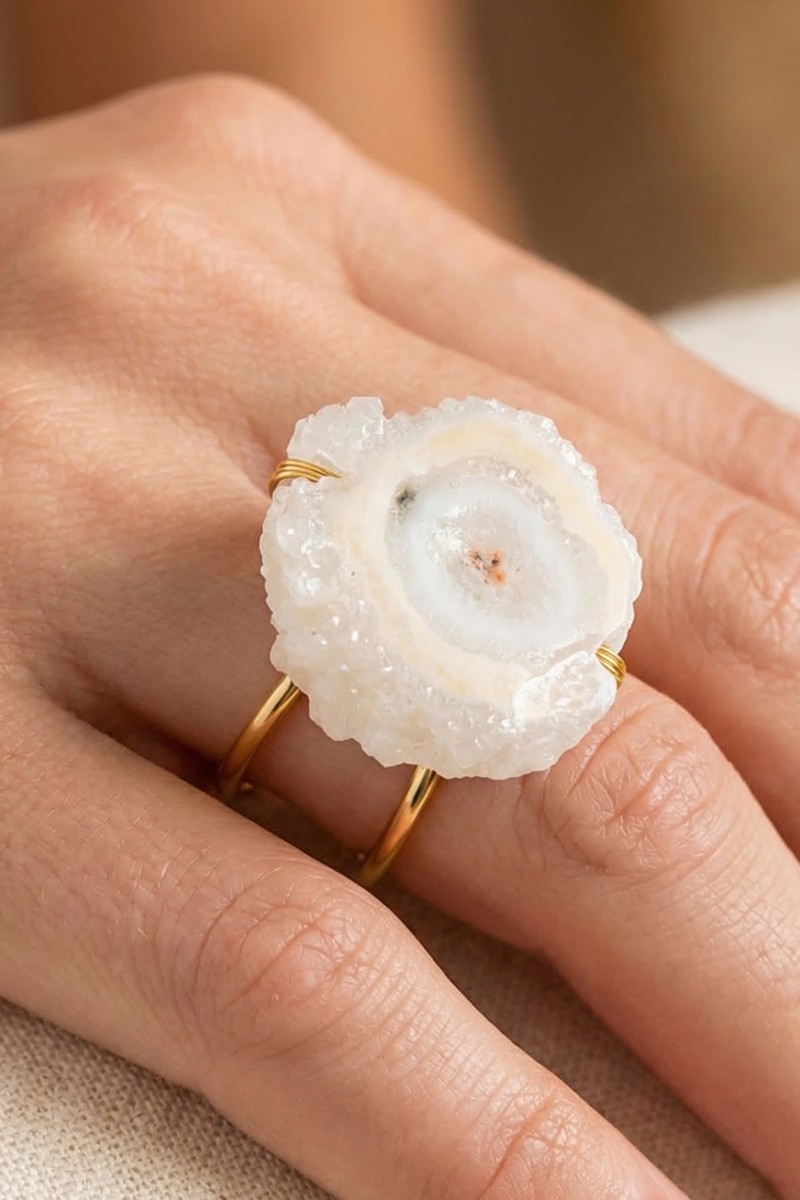 - This ring adds a modern natural freeform druzy stone style. Embark on a journey of sartorial refinement as this ring effortlessly complements your fashion sense.