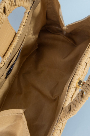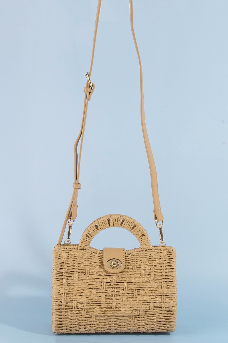 - This hand bag showcases a timeless natural woven straw structure top handle bag style. Immerse yourself in the world of understated glamour as this hand bag effortlessly exudes timeless appeal.