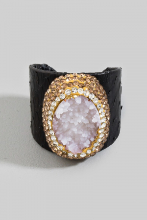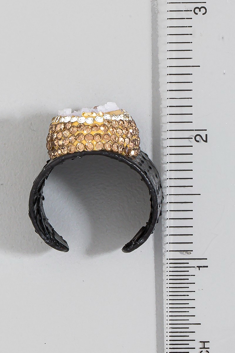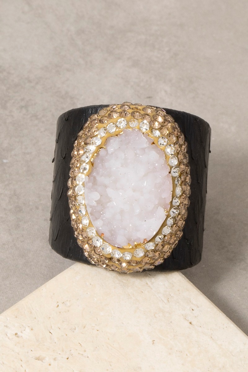 • This ring introduces a unique pave druzy stone with leather band statement style. Immerse yourself in the world of understated glamour as this ring effortlessly exudes timeless appeal.