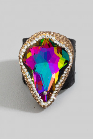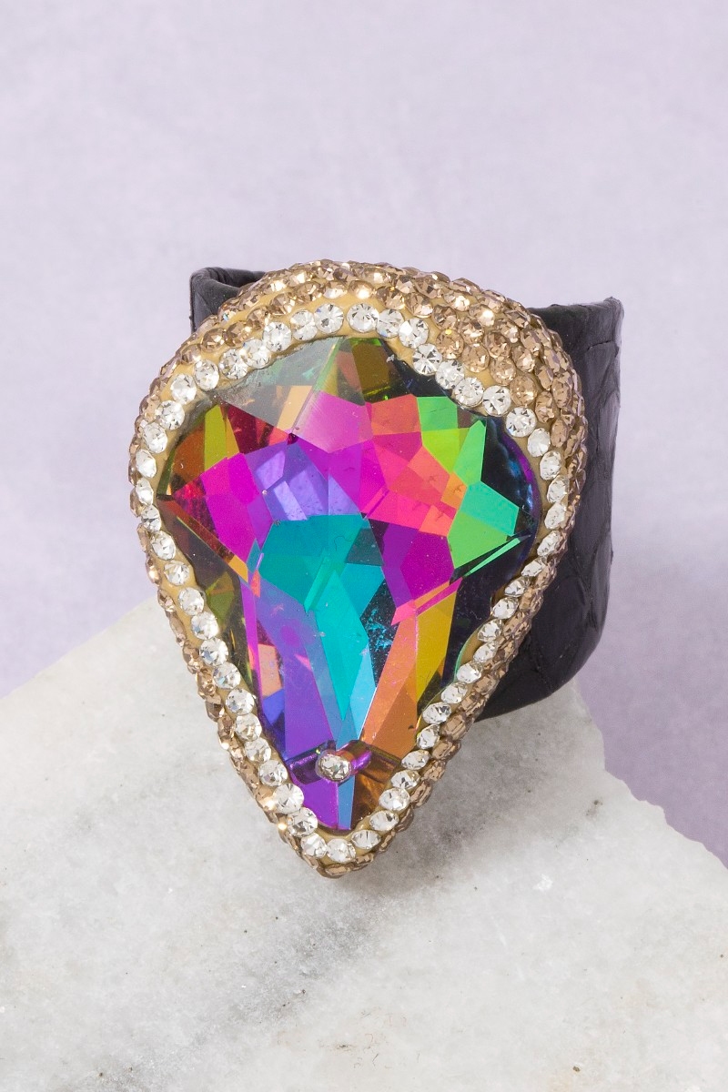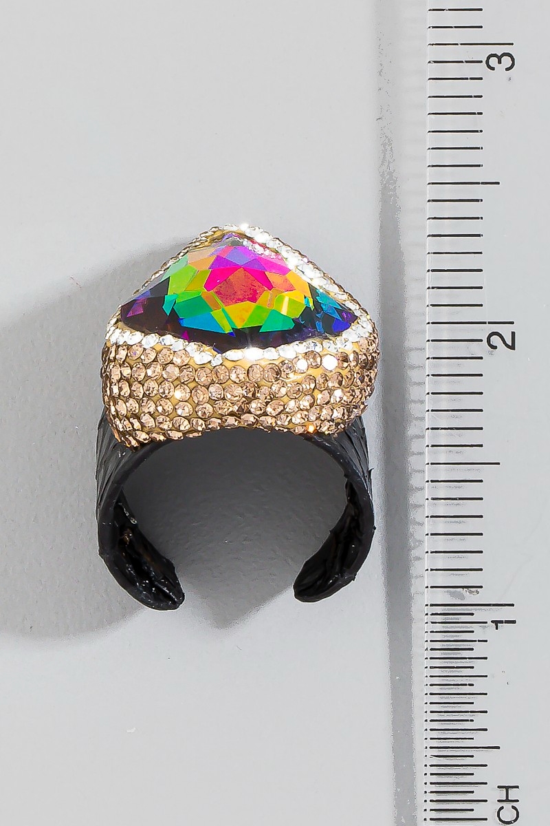 - This ring brings a unique pave faceted crystal stone with leather band style. Embark on a journey of sartorial refinement as this ring effortlessly complements your fashion sense.