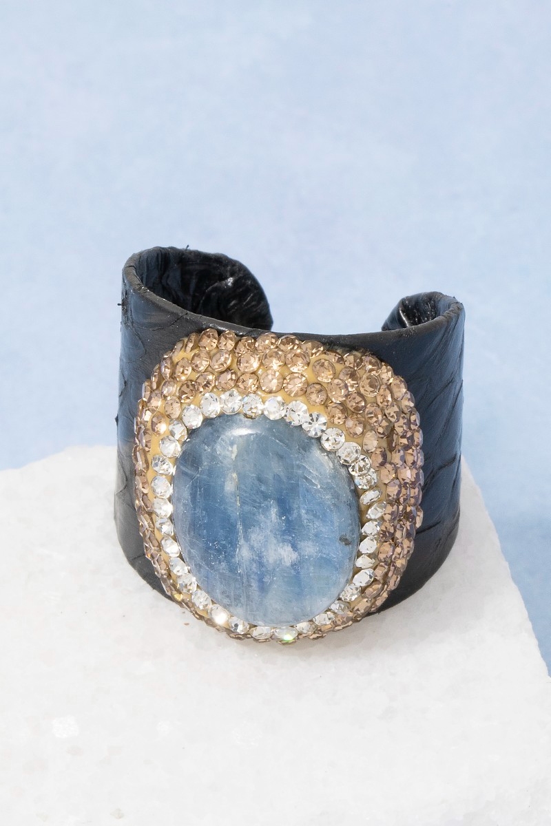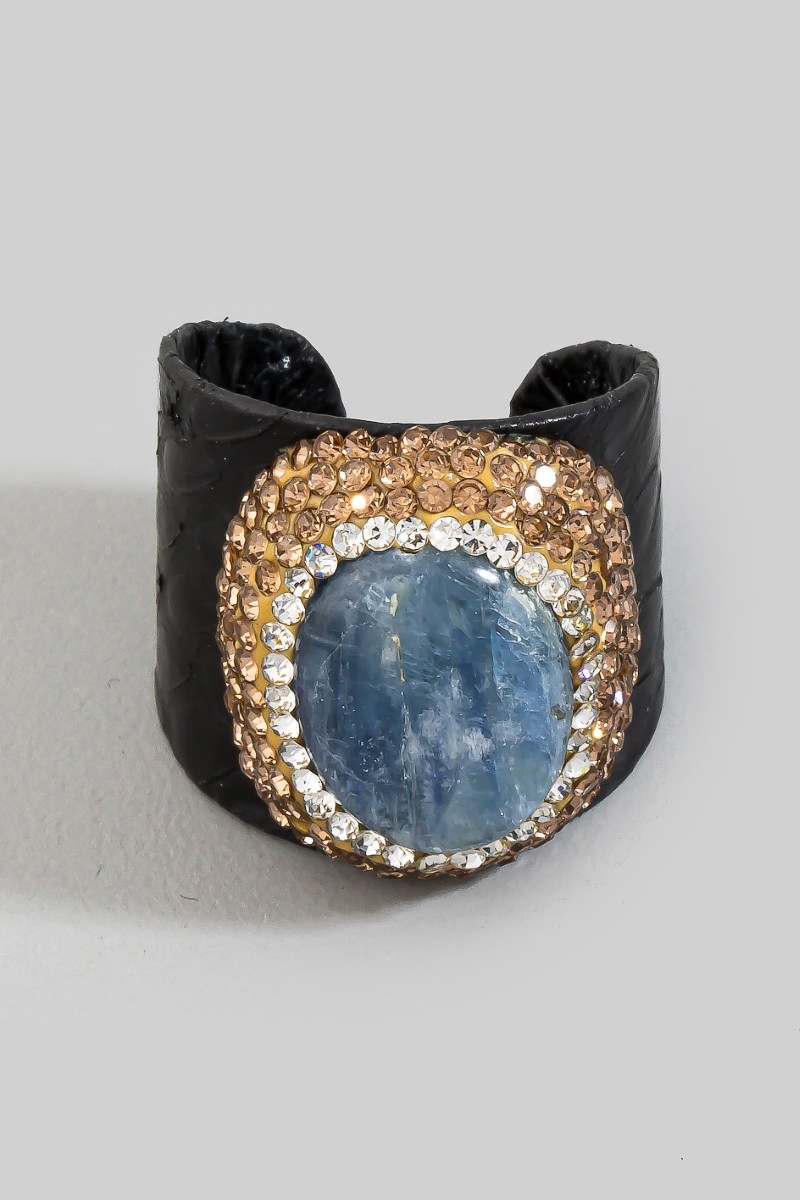 - This ring introduces a unique pave kyanite stone with leather band statement style. Indulge in the allure of exquisite craftsmanship as this ring effortlessly adds a touch of luxury to your attire.