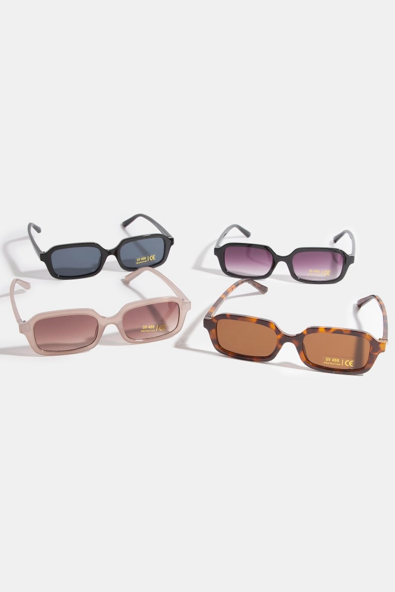 - This set of sunglasses introduces a unique plastic frame rectangle sunglasses set style. Savor the craftsmanship that goes beyond the ordinary, as this set of sunglasses effortlessly captivates attention.