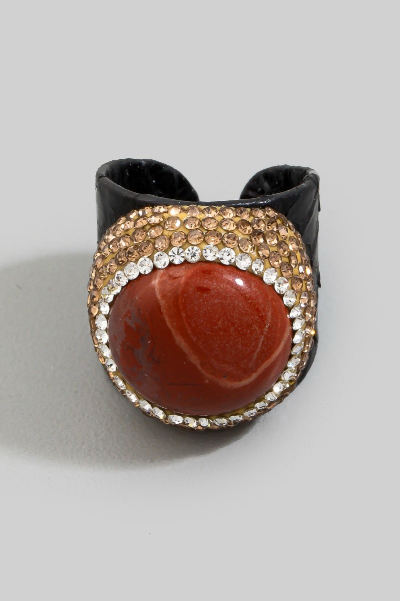 - This ring brings a unique red jasper stone pave leather band statement style. Immerse yourself in the details of design, as this ring effortlessly becomes a conversation starter.