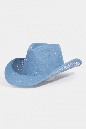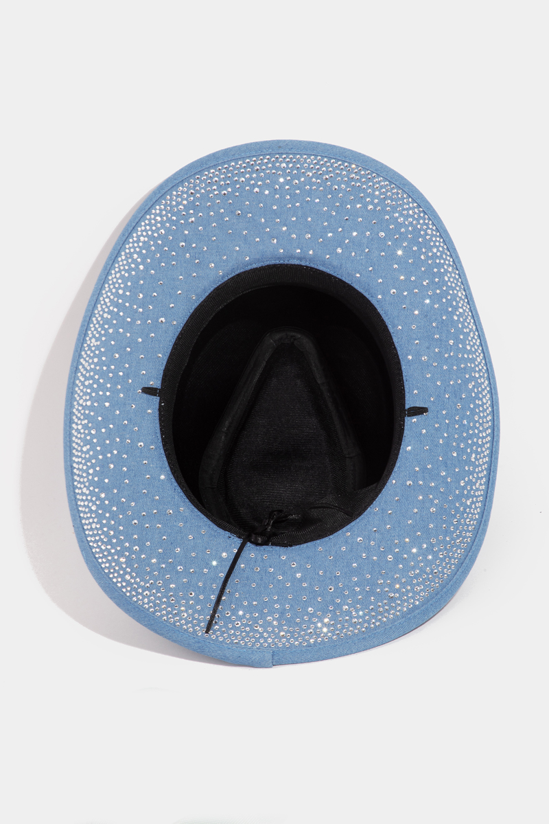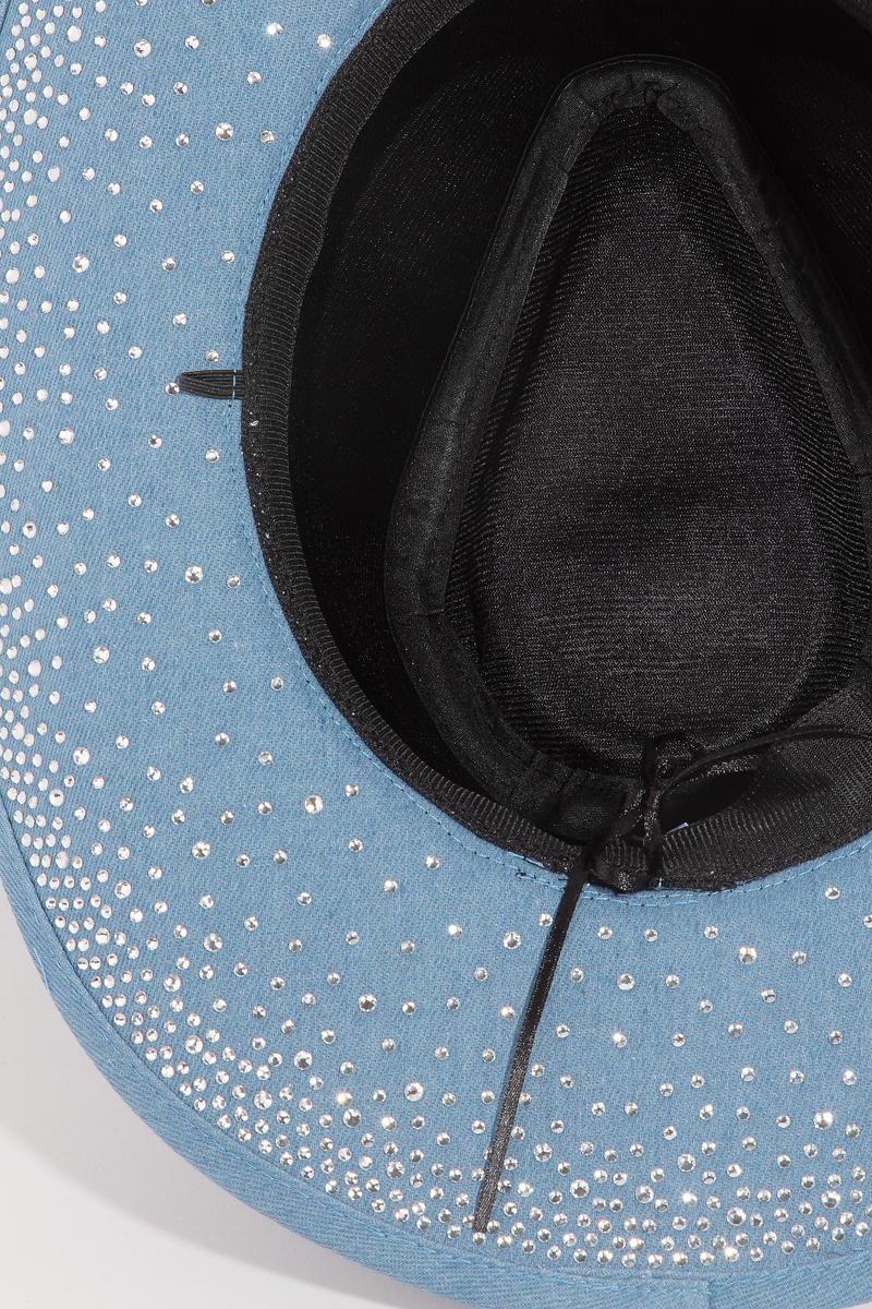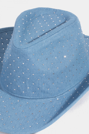 - This fedora hat brings a unique rhinestone encrusted denim cowboy style. Immerse yourself in fashion finesse with this statement fedora hat.