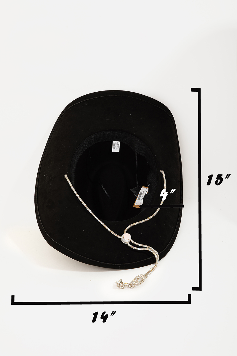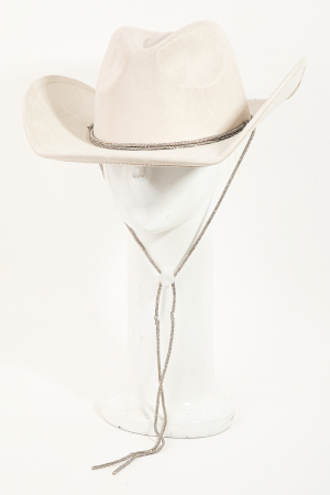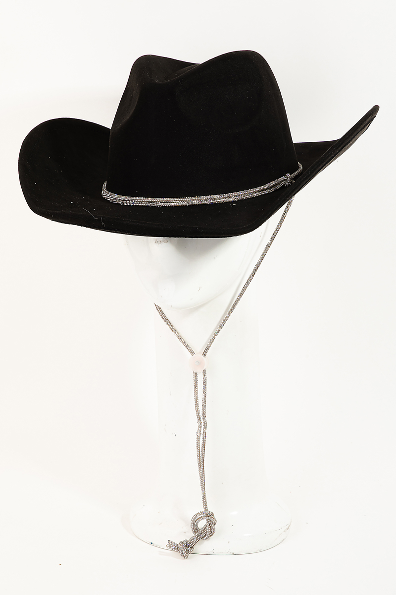 - This cowboy hat features a fashionable rhinestone rope strap western style. Celebrate the art of accessorizing with this piece that effortlessly encapsulates modern trends.