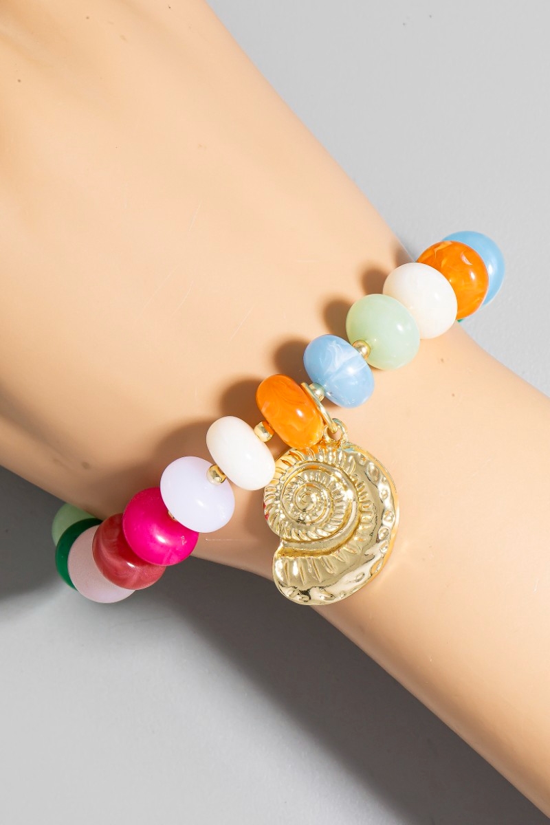 • This bracelet displays a vibrant sea shell dangle mixed resin beaded style. Witness the transformative power of accessories as this piece effortlessly redefines your fashion narrative.