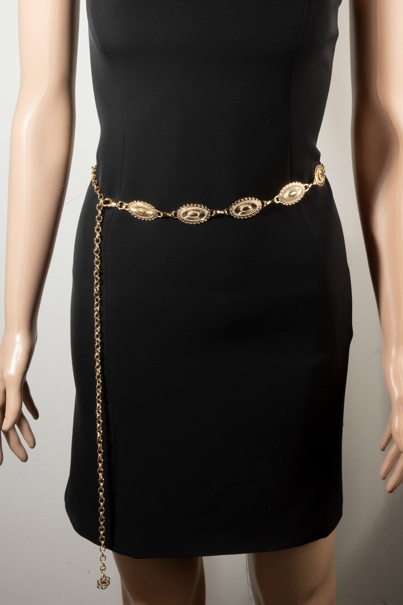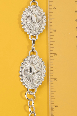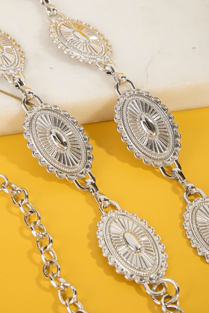 - This chain belt displays a vibrant small concho style. Immerse yourself in the world of understated glamour as this chain belt effortlessly exudes timeless appeal.