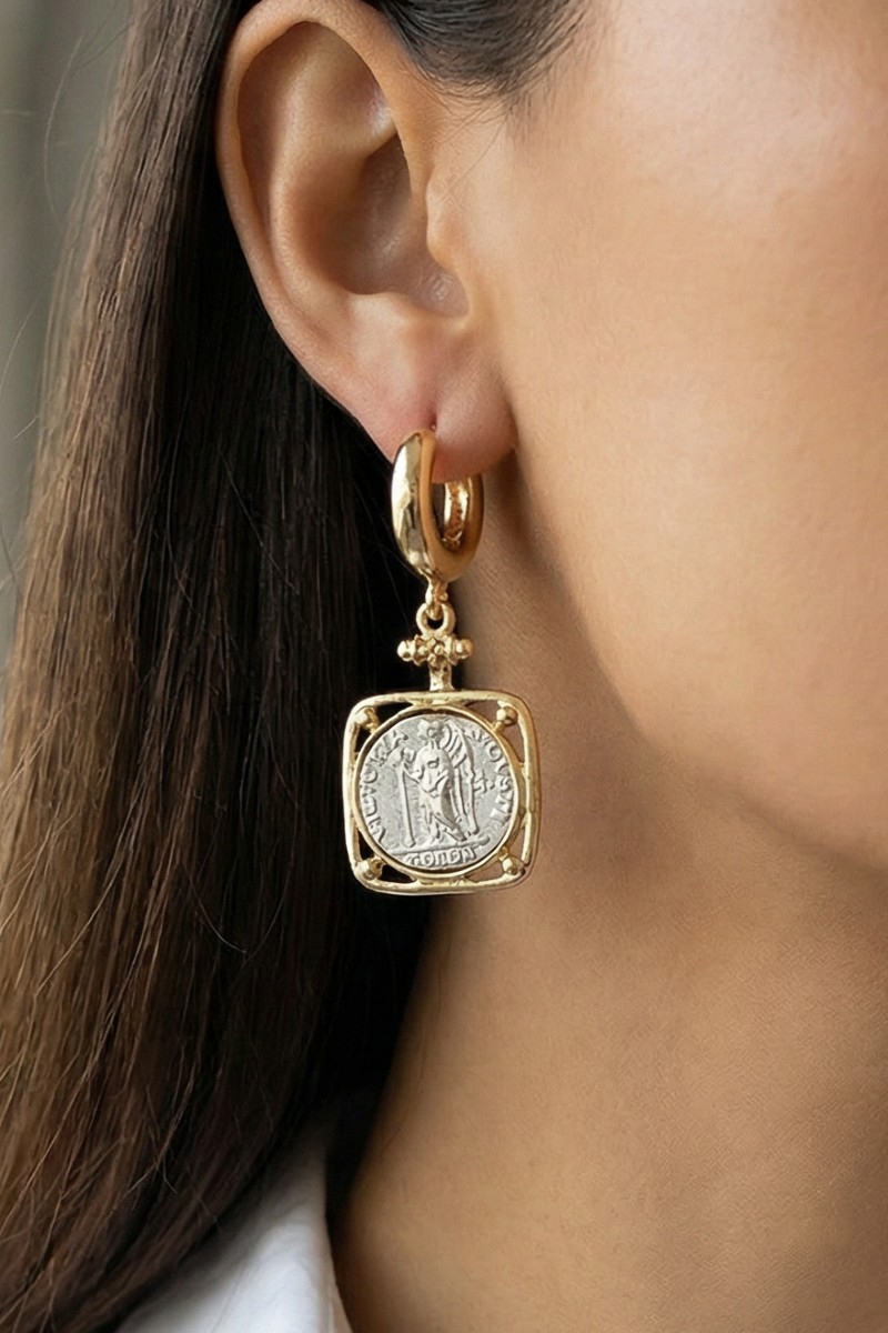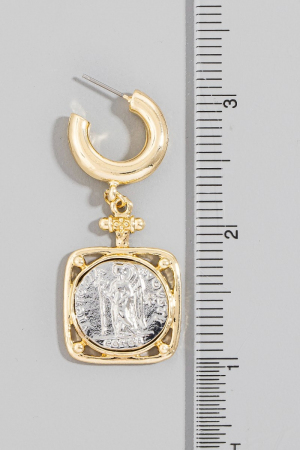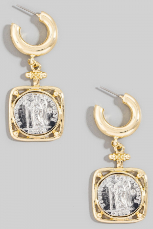 - This pair of hoop earrings showcases a unique square two tone saint coin charm style. Savor the allure of detailed craftsmanship in this exquisite pair of hoop earrings.