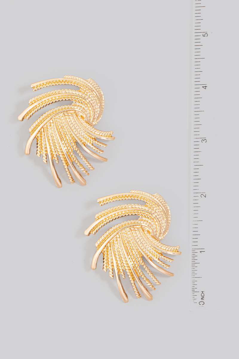 • This pair of earrings introduces a stunning textured metallic swirl shield style. Indulge in the artistry of accessorizing with this unique piece.
