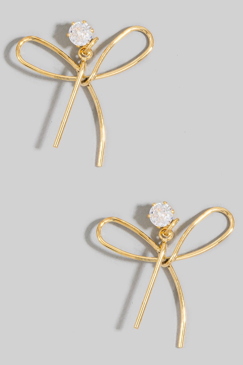 - This pair of drop earrings displays a vibrant thin metallic ribbon bow style. Experience refined sophistication with this understated yet stylish piece.