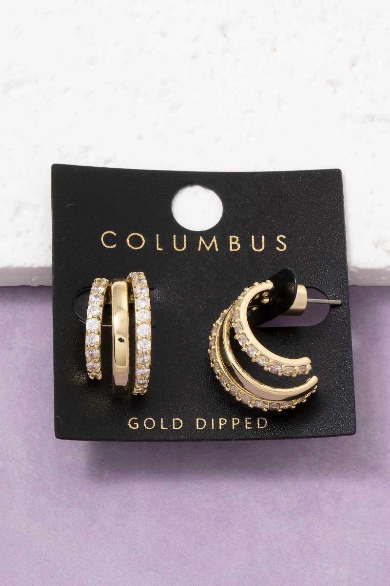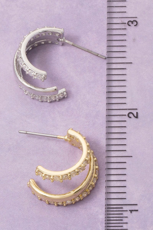 - This pair of earrings displays a vibrant three layer c hoop cubic zirconia style. Immerse yourself in the details of design, as this pair of earrings effortlessly becomes a conversation starter.