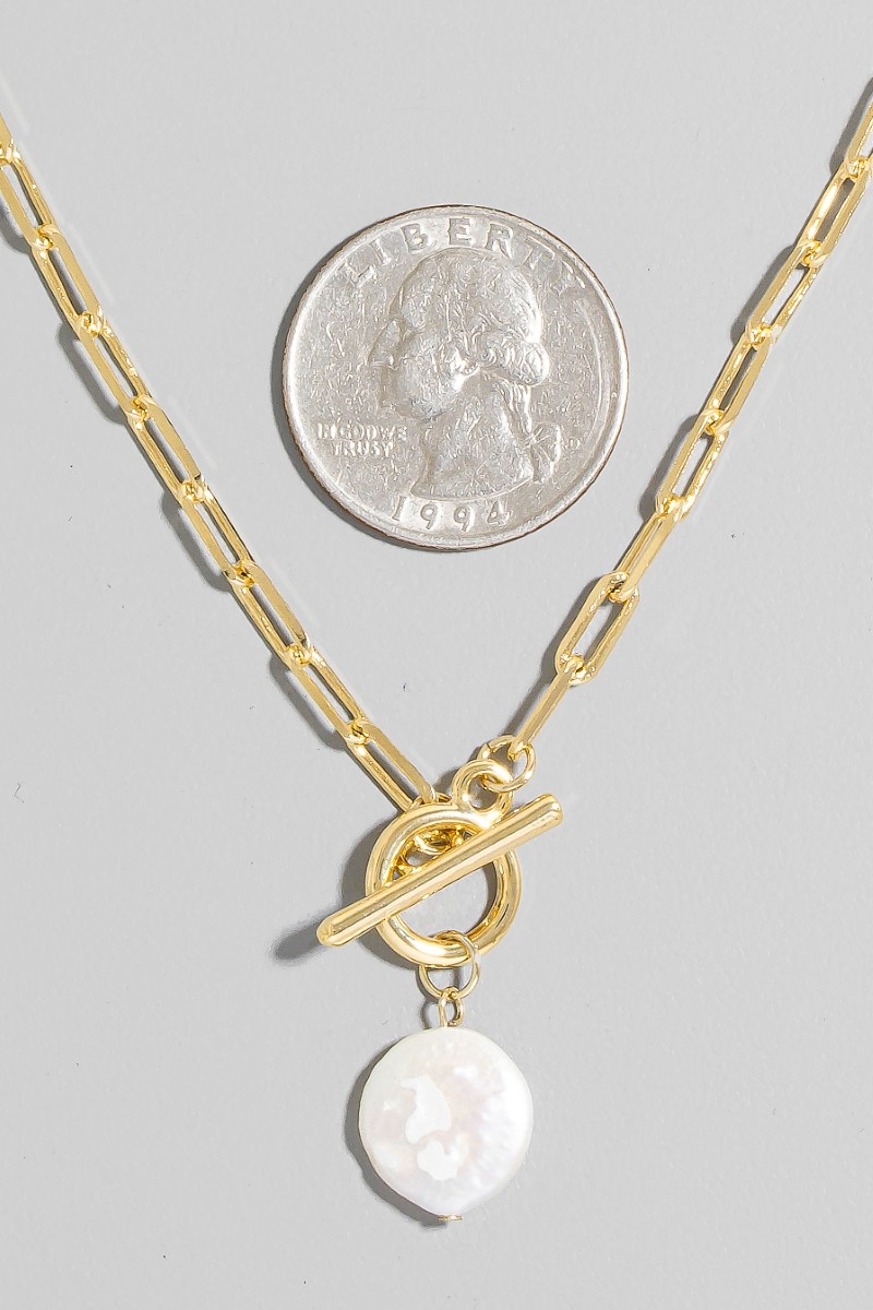 - This necklace features a fashionable toggle chain link disc pearl charm style. Explore a blend of classic charm and contemporary flair.
