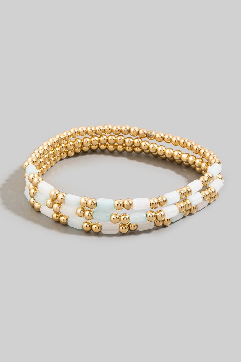 - This stretch bracelet features a fashionable tube & gold ball beaded set style. Immerse yourself in the details of design, as this stretch bracelet effortlessly becomes a conversation starter.