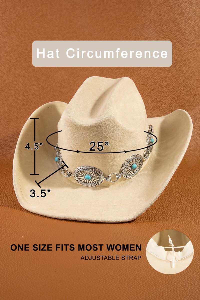 - This cowboy hat features a fashionable turquoise stud concho belt western style. Savor the allure of detailed craftsmanship in this exquisite cowboy hat.