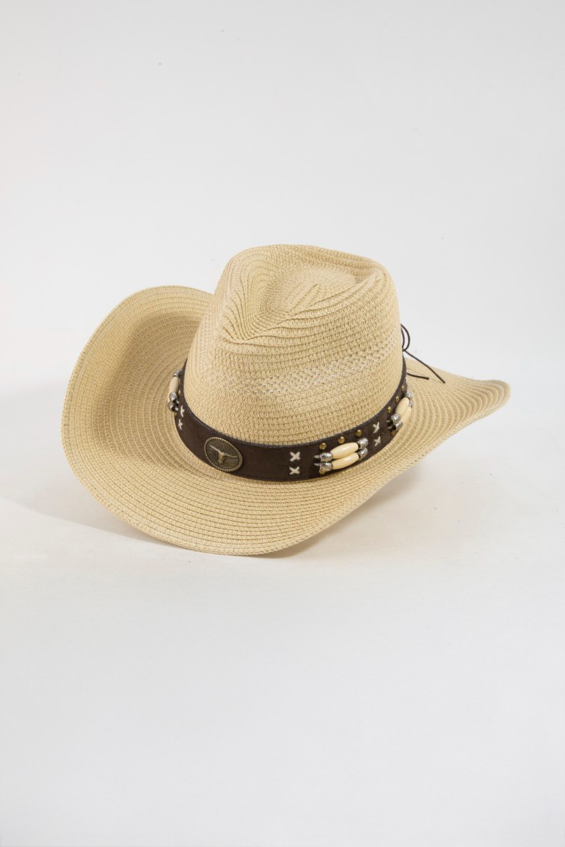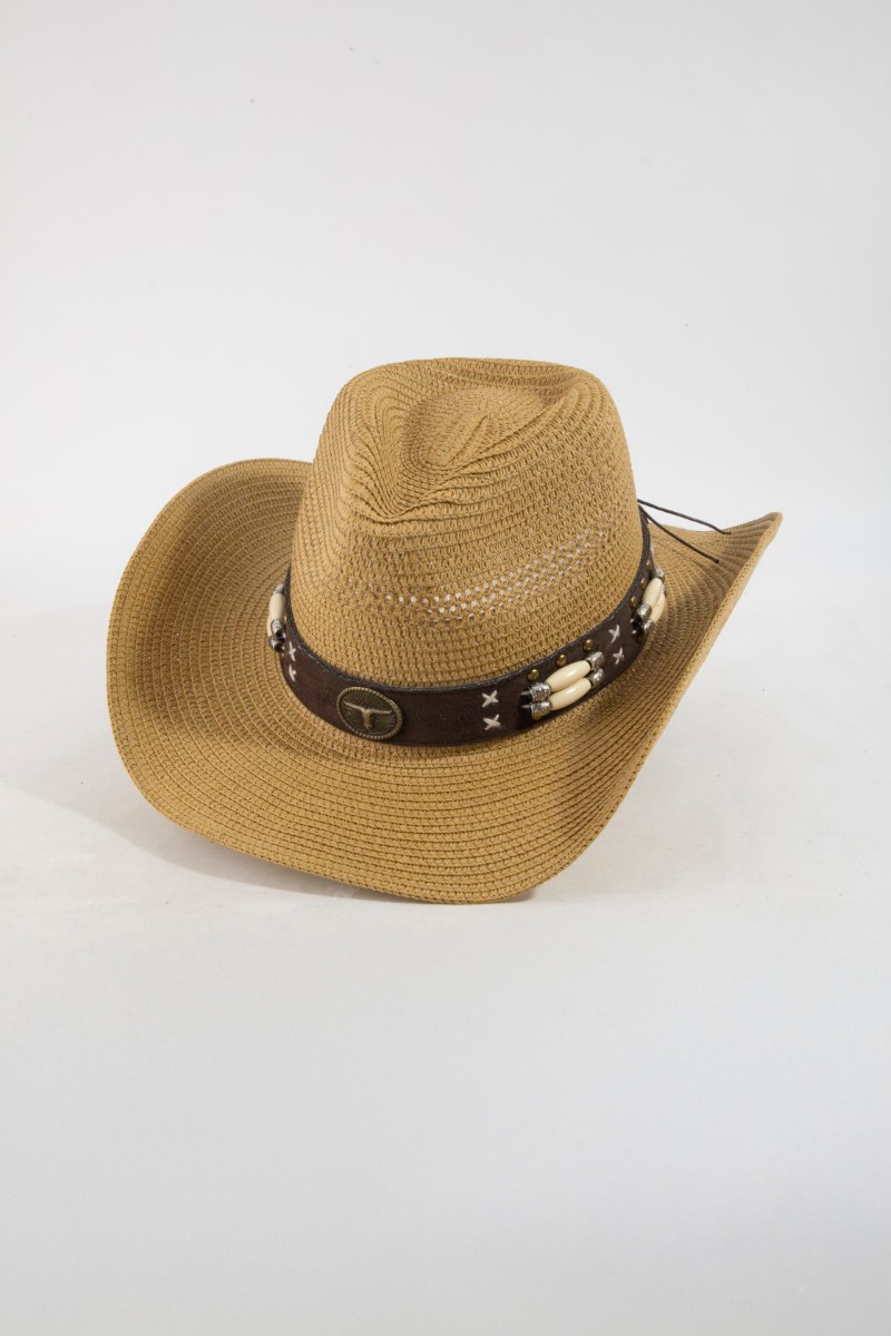 • This cowboy hat displays a vibrant western strap straw braided style. Indulge in the artistry of accessorizing with this unique piece.